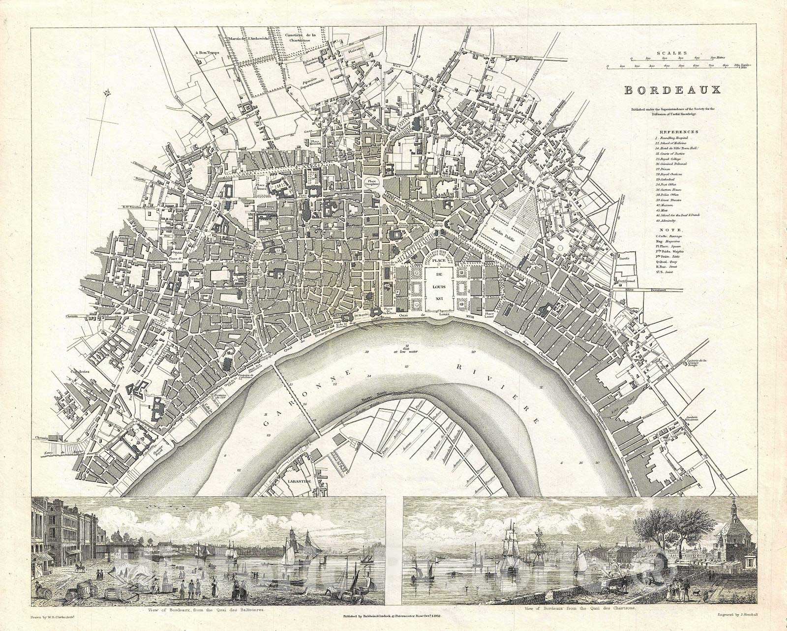 This map is a steel plate engraving, dating to 1832 by the Society for the Diffusion of Useful Knowledge, S.D.U.K. It represents the city of Bordeauin x, famous for its extraordinary French Wines. This fascinating map depicts the streets of Bordeauin x with such incredible detail that even individual buildings are labeled. The bottom of the map is decorated with two views. One is a 'View of Brodeauin x from the Quai des Salinieres' and the other is a 'Vies of Bordeauin x from the Quai des Chartrons.'