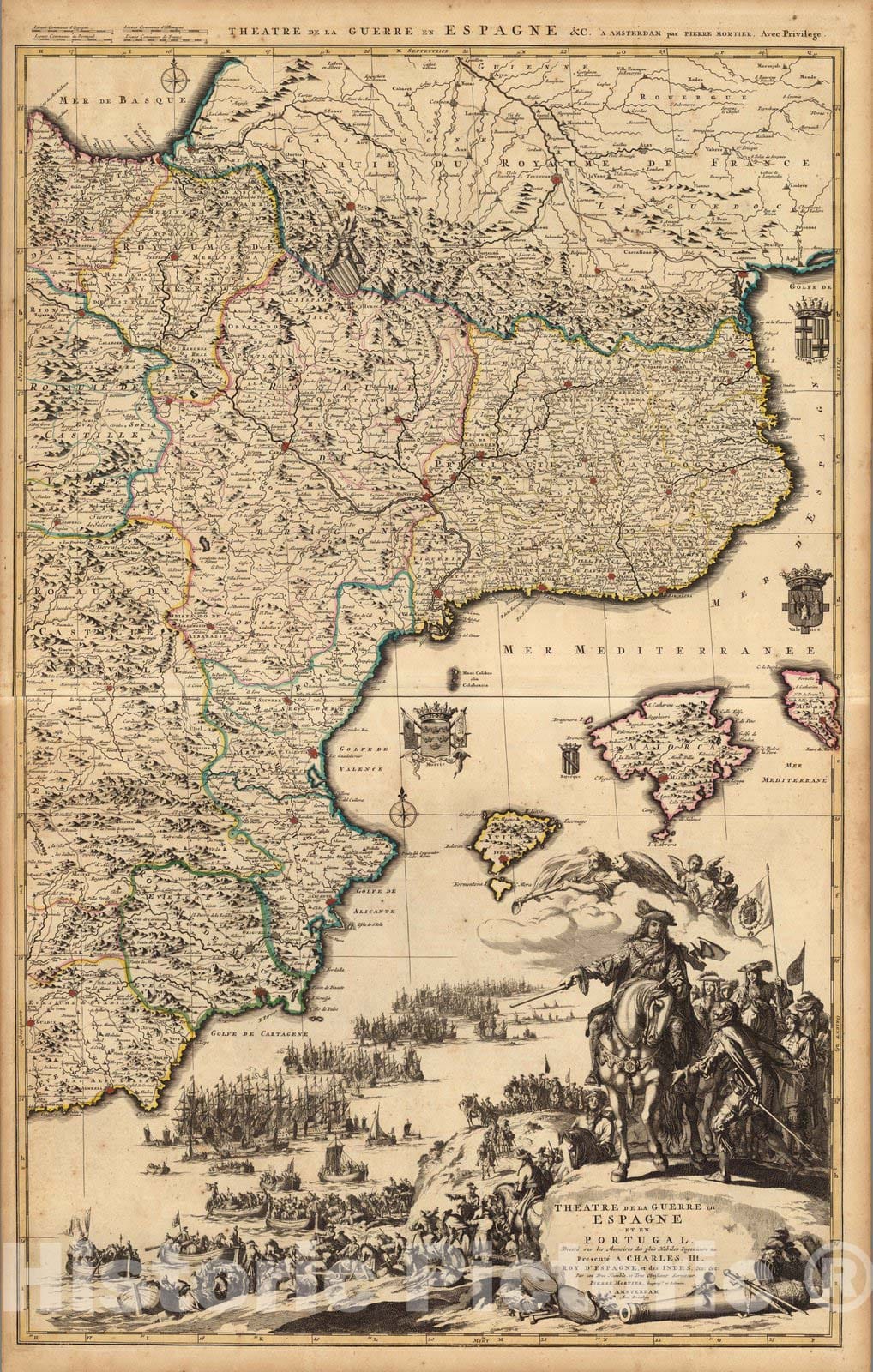 Theatre de la Guerre en Espagne et en Portugal (eastern portion). | Atlas Nouveau Contenant Toutes Les Parties du Monde, ou Sont exactement Remarques Les Empires, Monarchies, Royaumes, Estats, Republiques & Peuples qui fy trouuent a present. Par le Sr. Sanson, Geographe ordinaire du Roy. Presente a Monseigeur le Dauphin ... Hubert Jaillot Geographe du Roy. A Paris, Chez Hubert Jaillot .... | This issue of the Mortier/Jaillot Atlas Nouveau has 169 maps (1 more than the normal count of 168) plus diagrams, text pages, decorated titles and index pages. It is noted for the large number of multi-sheet "Theatre de la Guerre" (Theater of War) maps covering the battles raging in Europe and the Americas during the Spanish War of Succession (1701-1713) and the Northern War (1700-1721). The Atlas Nouveaux was first published by Jaillot in Paris in 1681(46 maps) with later issues by him in 1684 (72 maps) and 1689 (80 maps). In 1692 Pierre Mortier published his first edition of the Jaillot atlas with 99 maps, another edition followed in 1696 with 111 maps. In 1707/1708 Mortier issued our edition with 168 maps. Later editions by Mortier expanded the atlas even further - 1708, 200 maps; ca 1721, 300 maps; ca 1735, 400 maps. The atlas maps are large folio size with most maps made of two sheets and many maps combining 4 or 6 sheets (those also issued as wall maps separately). The atlas is most impressive for its large size and number of maps as well as being up to date for its time. This copy colored in outline with relief shown pictorially.