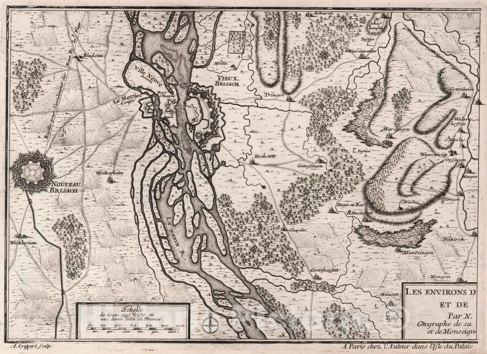 • Historic Map : World Atlas Map, Les Environs des Deux Brisachs Fribourg (western sheet), France. 1705 - Vintage Wall Art