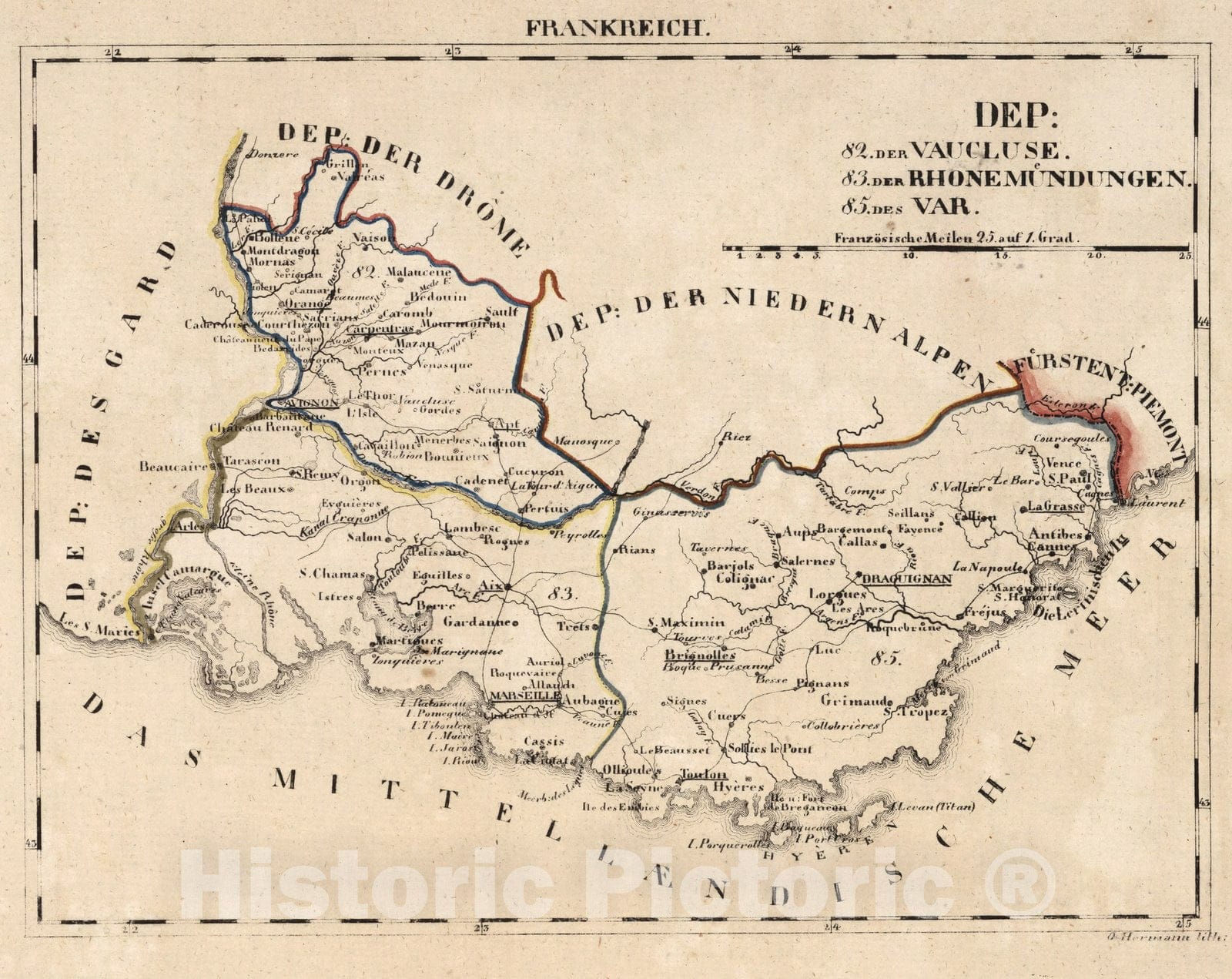 Frankreich. DEP: 82. Der Vaucuse. 83. Der Rhonemundungen. 85. Des Var. O. Hermann, Lith. (to accompany) Atlas von Europa nebst den Kolonien : bearbeitet von W. E. A. v. Schlieben ... Leipzig bei Georg Joachim Goschen 1825. | Atlas von Europa nebst den Kolonien : fur Geschaftsmanner, Zeitungsleser und Besitzer des Conversations-Lexicons in einer Folge von Charten und einem alphabetisch eingerichteten Texte : bearbeitet von W. E. A. v. Schlieben ... Leipzig bei Georg Joachim Goschen 1825. O. Hermann, Lith. | Early topographical map of Europe, together with the colonies for businessmen, newspaper readers ... by German geographical author, Wilhelm August von Schlieben (1781-1839), published in parts from 1825, in 3 volumes, and 15 parts; volume 1: 1-5, Volume 2: 6-10, Volume 3: 11-15. Each volume includes outline hand colored maps, manuscript index, forward, table of content, extensive descriptive text and index. Bound in half leather green marbled paper covered boards measuring 26.5x34.5, with "Atlas von Europa ... Lieferung" embossed on the spine. (v.1) 1. lief. Konigreich Frankreich. I. Heft. 2. lief. Konigreich Frankreich. II. heft. und das Turkische (Osmanische) reich in Europa. 3. lief. Die Helvetische eldgenossenschaft oder die Schweiz und das konigreich Portugal. 4. lief. Das konigreich Spanien. 5. lief. Die konigreiche 1) der Niederlands 2) Danemark. und 3) Schweden mit Norwegen.--(v.2) 6. lief. Der deutsche staatebund und zwar die suddeutschen staaten. 7. lief. Der deutsche staatenbund, und zwar der nordwestliche theil der nordeutschen staaten. 8. lief. Der deutsche staatenbund. und zwar der nordostliche theil der norddeutschen staaten. 9.-10. lief. Der Preussische staat.--(v.3) 11-12. lief. Der Osterreichische staat oder das kaiserthum Oesterreich. 13. lief. Das Russische reich in Europa mit ausschiuss von Polen. 14. lief. Das konigreich Polen, die republik Krakau, die Italienischen staaten. 15. lief. Das Britische reich.