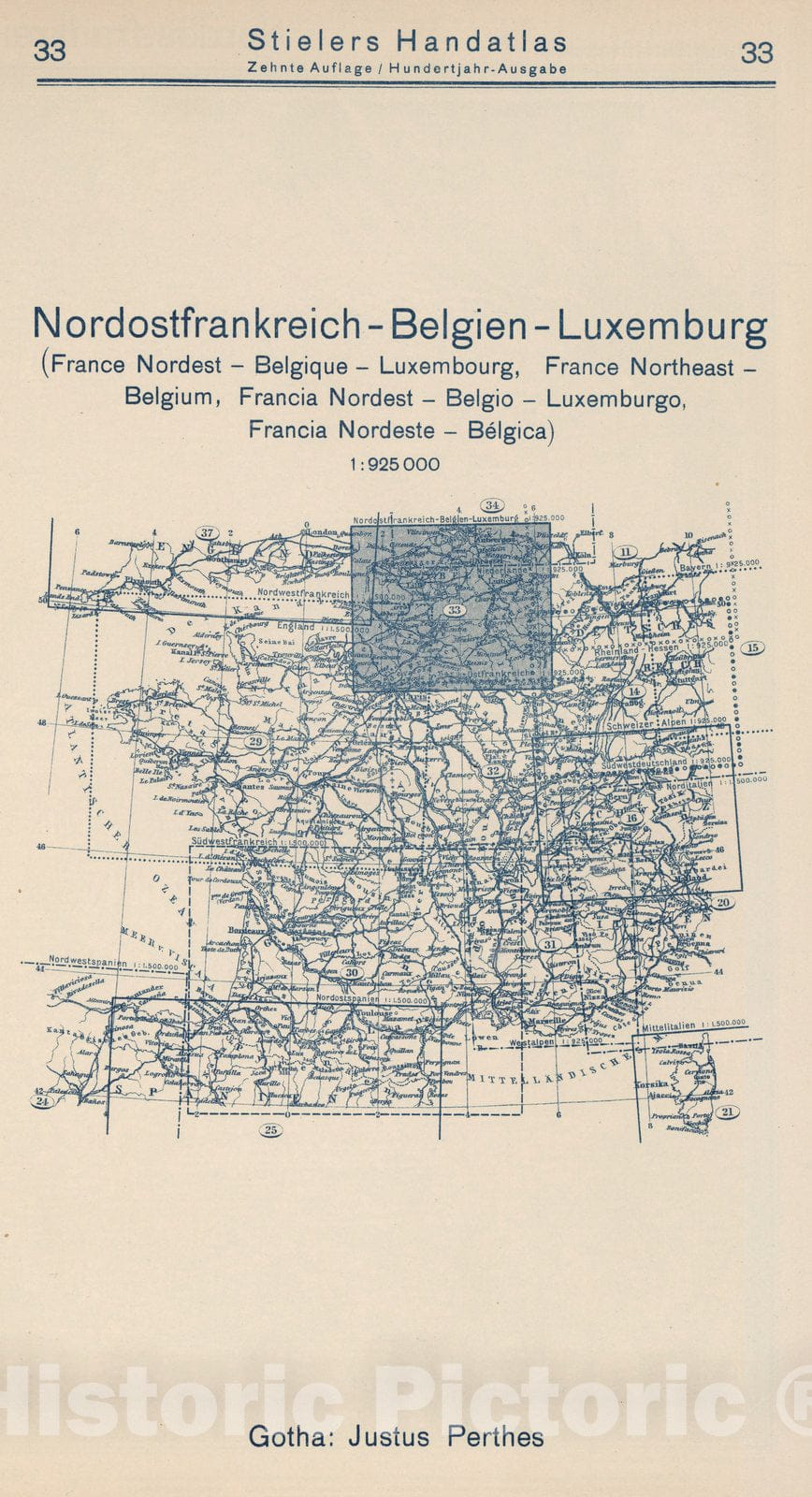 (Index Map) 33. Nordostfrankreich - Belgien - Luxemburg. France Northeast - Belgium. | Stieler's Atlas of Modern Geography. 254 Maps & Insets on 108 Sheets Engraved on Copper. Tenth (Centenary) Edition. Completely Revised & Largely Redrawn under the Direction of Professor H. Haack in Justus Perthes' Geogr. Institute. (in two parts). 1925. Gotha: Justus Perthes. | Two volume set in English. 10th edition and the Centenary edition. This edition was a very important revision and was issued in German, French, English, Spanish, and Italian. Each map preceded by index map, printed in blue, which is labeled, "Stielers Handatlas, Zehnte Auflage / Hundertjahr-Ausgabe. Gotha: Justus Perthes." Relief shown in hachures. Alphabetical Index of place names not scanned. Over 43 different draftsmen and engravers are listed on the various sheets.