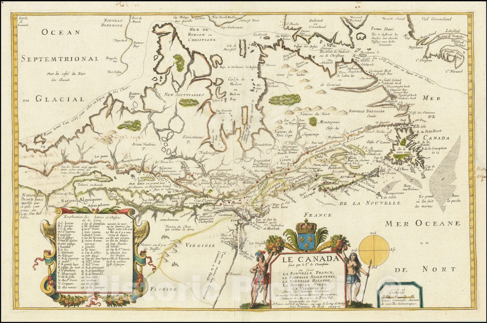 Historic Map : Le Canada faict par le Sr. de Champlain.ou sont La Nouvelle France, La Nouvelle Angleterre, La Nouvelle Holande, La Nouvelle Suede, La Virginie &c,1677, 1677, Vintage Wall Art