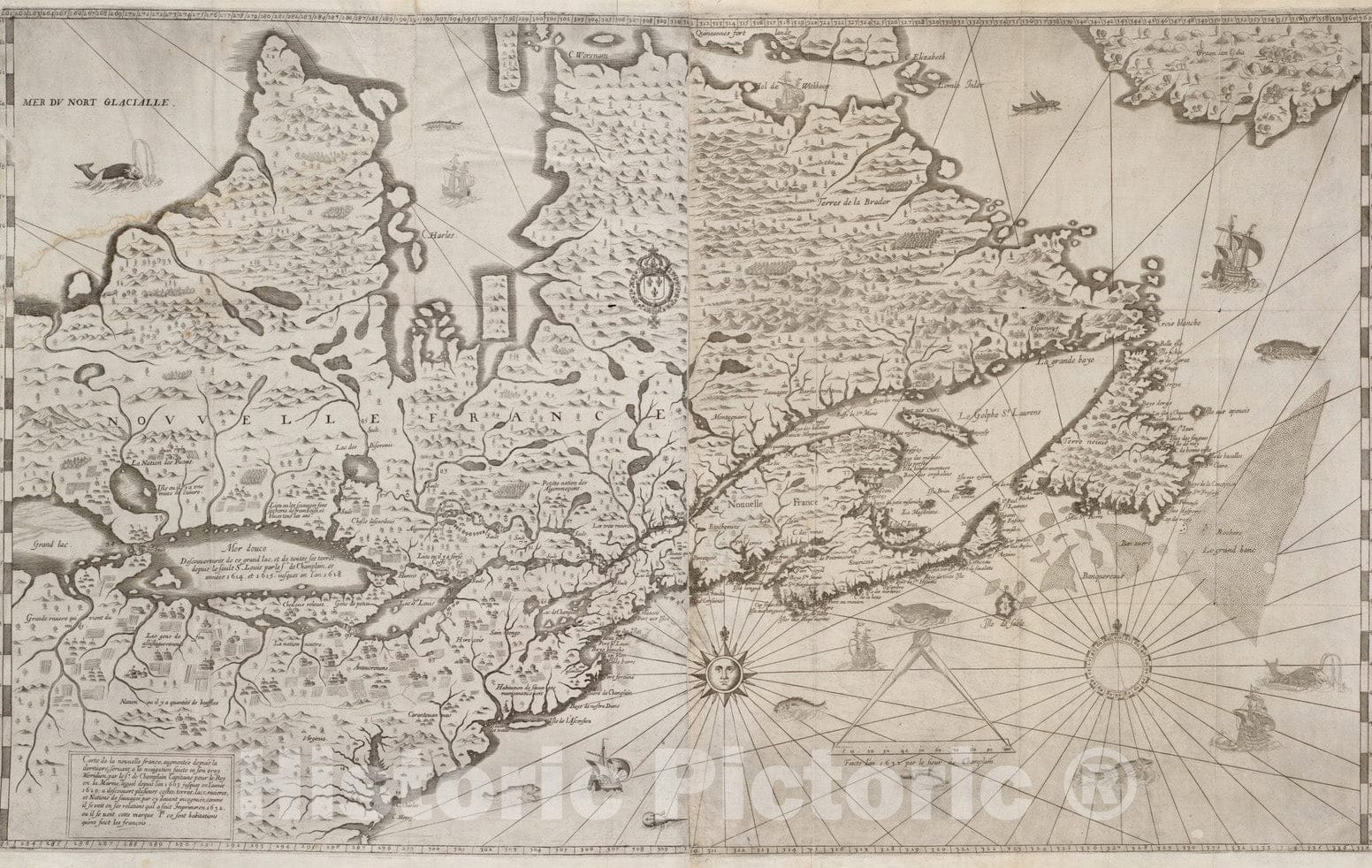 • Historical Map, 1632 Carte de la Nouuelle France, augmentee Depuis la derniere, seruant a la Navigation faicte en Son vray Meridien, Vintage Wall Art