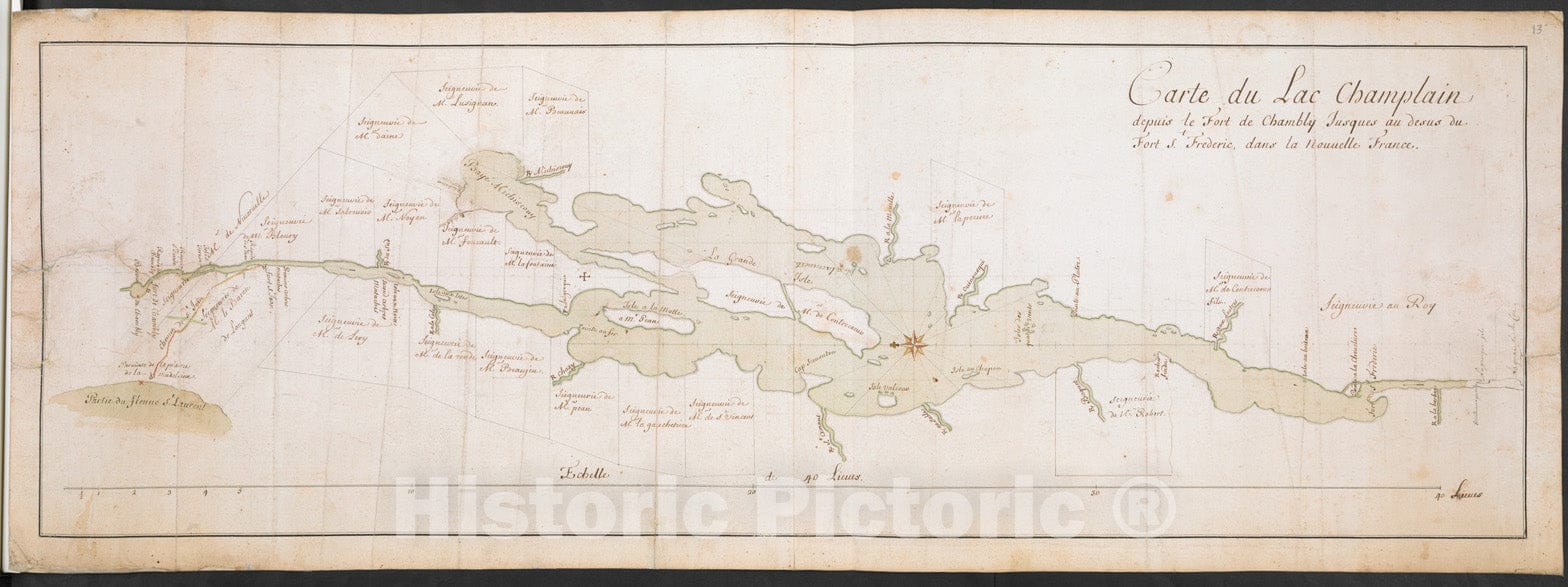 Historical Map, 1739-1759 Carte du Lac Champlain Depuis le Fort de Chambly Jusques au desus du Fort S.t Frederic, Dans la Nouvelle France, Vintage Wall Art