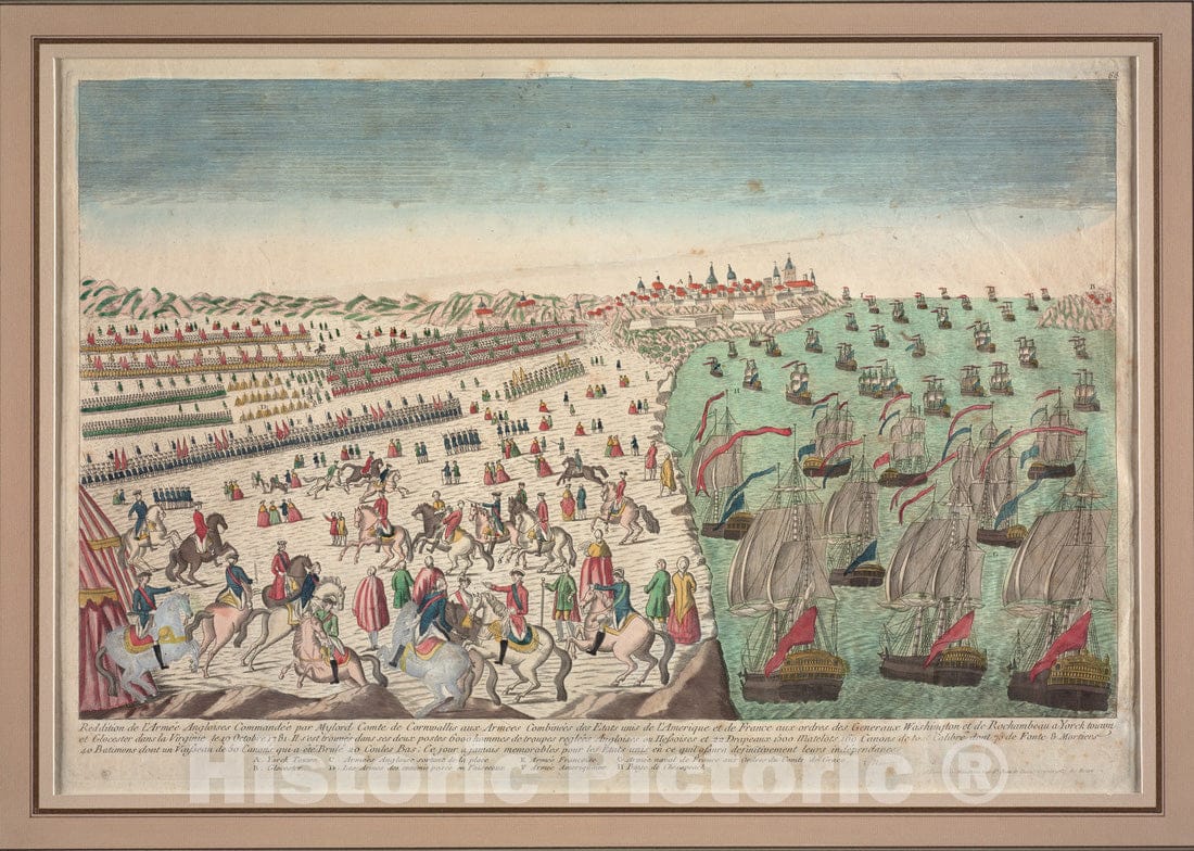 This print offers a French perspective of the British surrender at Yorktown. The image portrays Yorktown as a bustling city with European-style buildings with domes and towers. Dozens of ships, standards raised, sail in the river as soldiers stand in formation on the shore. Officers on horses celebrate as male and female civilians observe the scene. This print highlights the French military contributions to the American victory over the British. This lively scene aimed to resonate with Frenchmen celebrating the British defeat.