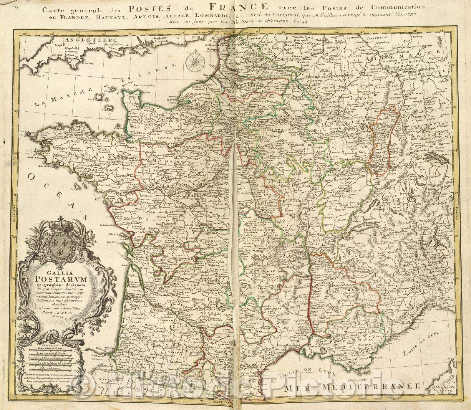 Historic Map : Carte generale des postes de France avec les postes de communication en Flandre, Haynaut, Artois, Alsace, Lombardie, andc, c. 1708 , Vintage Wall Art