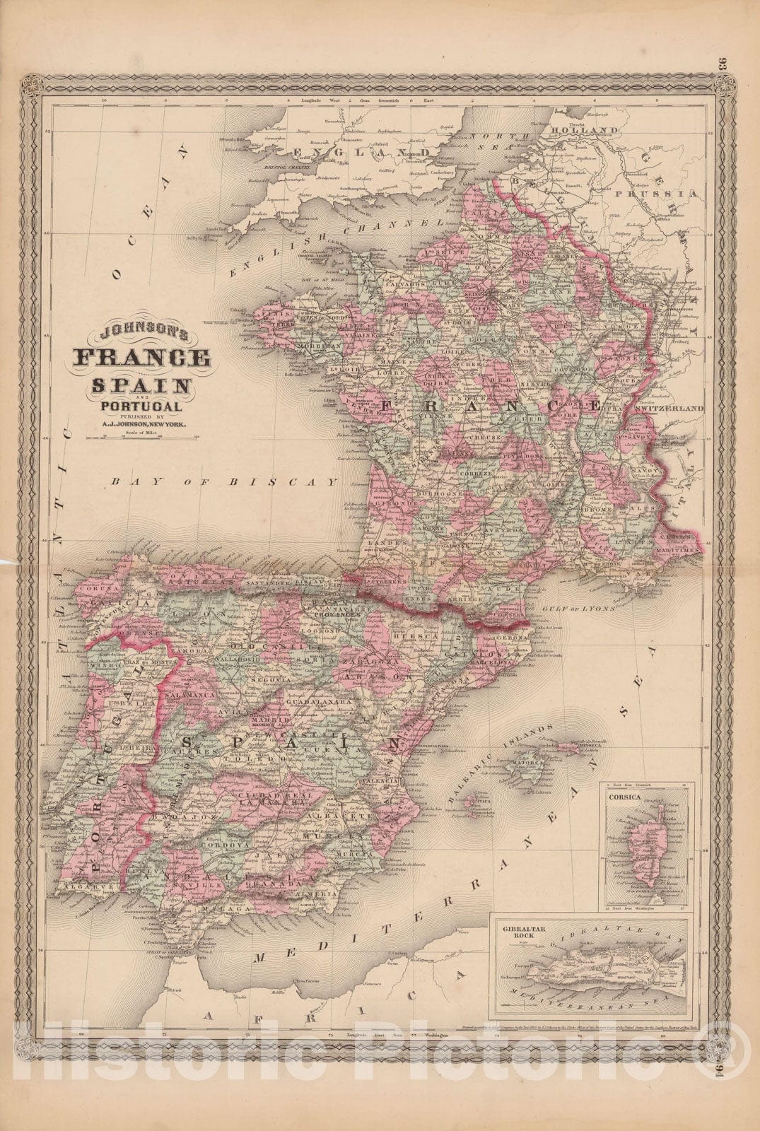 Historic Map : Family Atlas World, France & Spain & Portugal 1873 , Vintage Wall Art