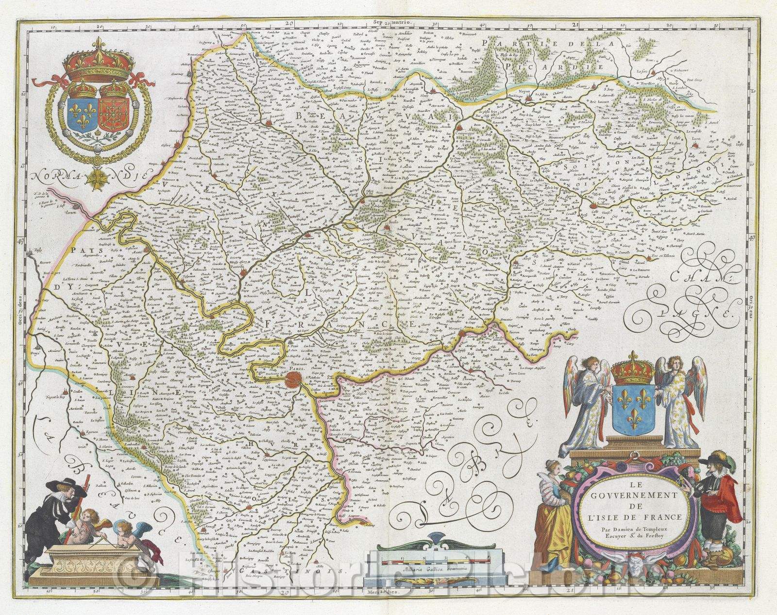 • .Historic Map : Le Gouvernement de l'Isle de France par Damien de Templeux Escuyer Sr. du Frestoy, c. 1664 , Vintage Wall Art