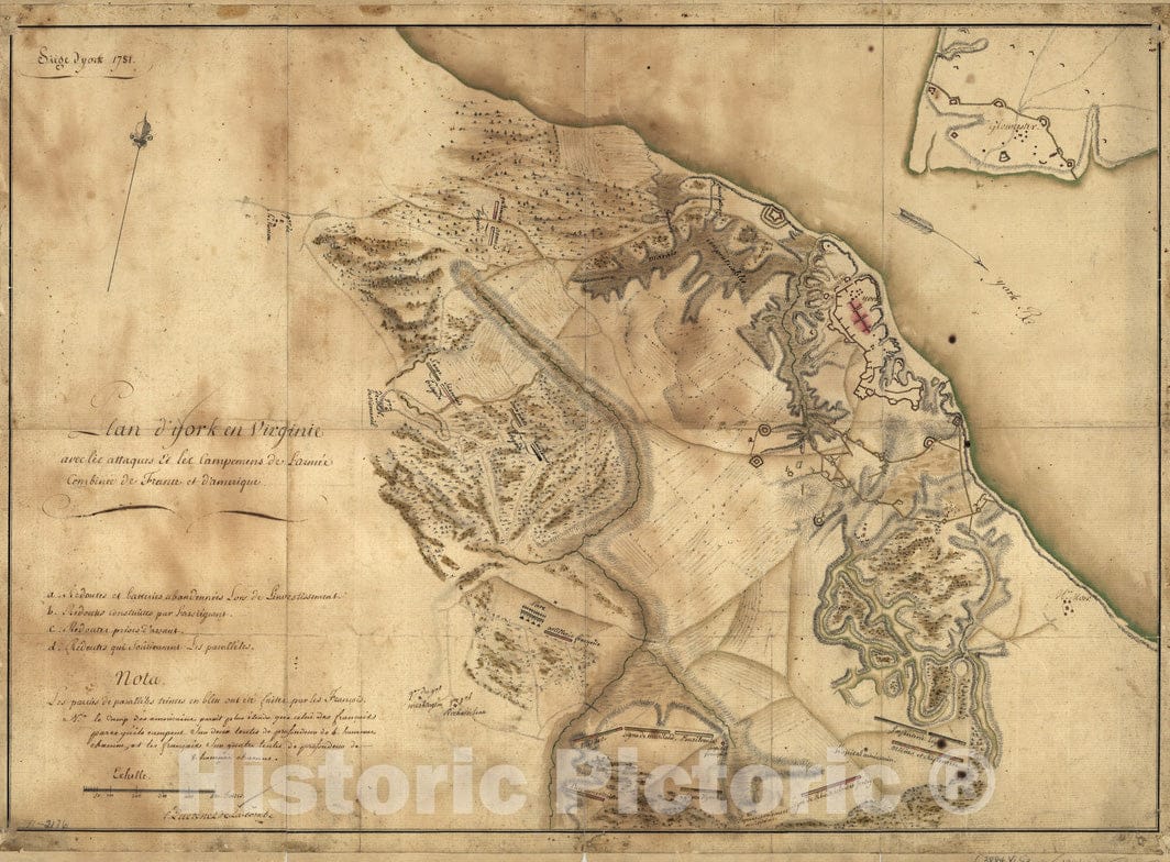 Historical Map, Siege d'York, 1781 : Plan d'York en Virginie avec les attaques et les campemens de l'ArmeIe combineIe de France et d'AmeIrique, Vintage Wall Art