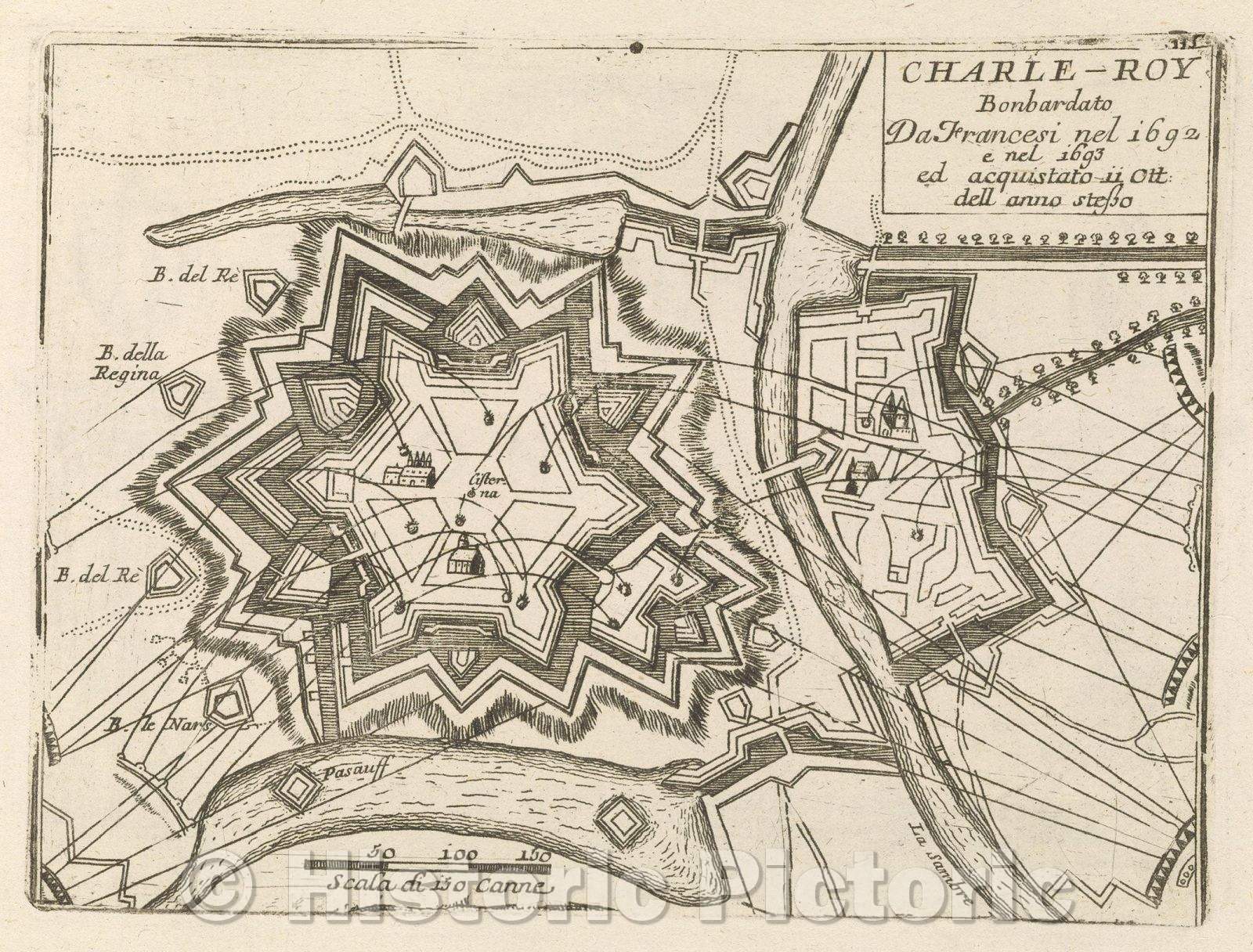 Theater of war, divided into 48 parts, Charle-Roy Bonbardato Da Francesi nel 1692, 1692
