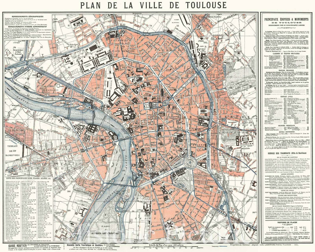 Historic Map : Plan of Toulouse, France, Labouche Freres, 1921, Vintage Wall Art