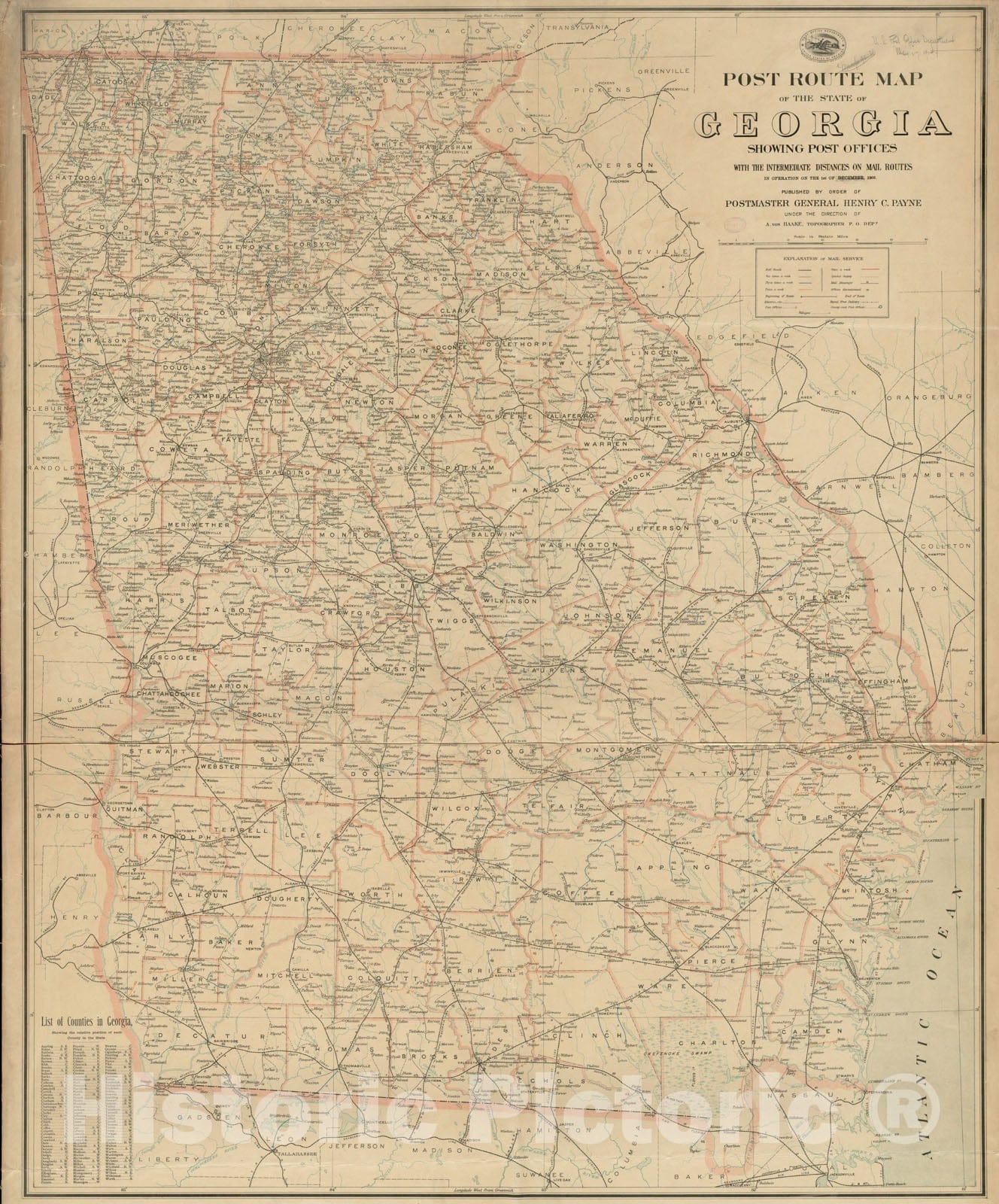 Historical Map, Post Route map of The State of Georgia Showing Post Offices with The Intermediate Distances on Mail Routes in Operation on The 1st of December, 1903, Vintage Wall Art