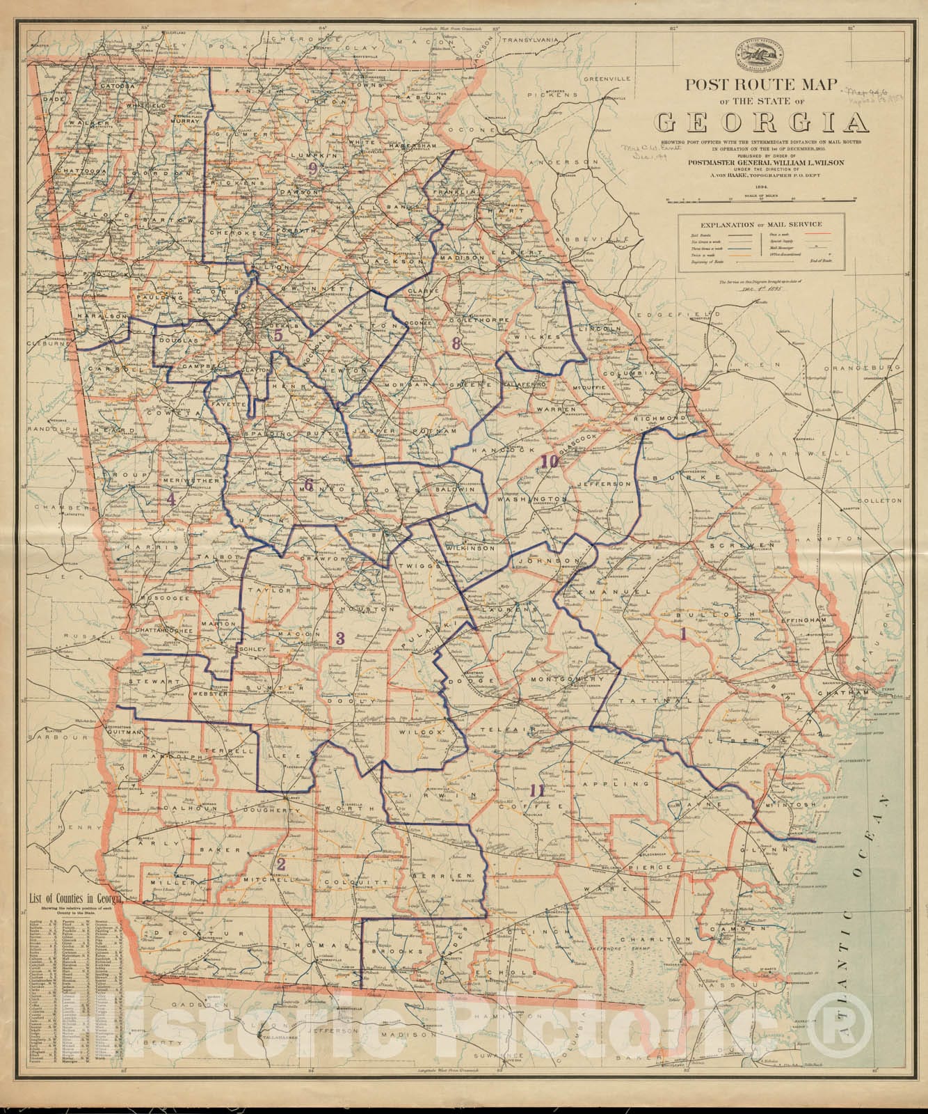 Historical Map, Post Route map of The State of Georgia Showing Post Offices with The Intermediate Distances and Mail Routes in Operation on The 1st of December, 1895, Vintage Wall Art