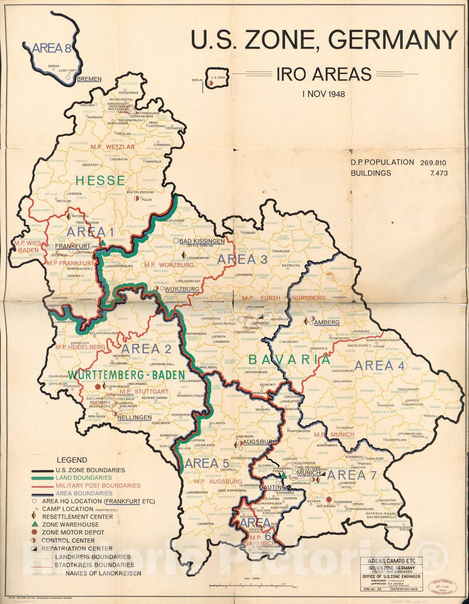 • Historic 1948 Map - U.S. Zone, Germany IRO Areas, 1 Nov 1948