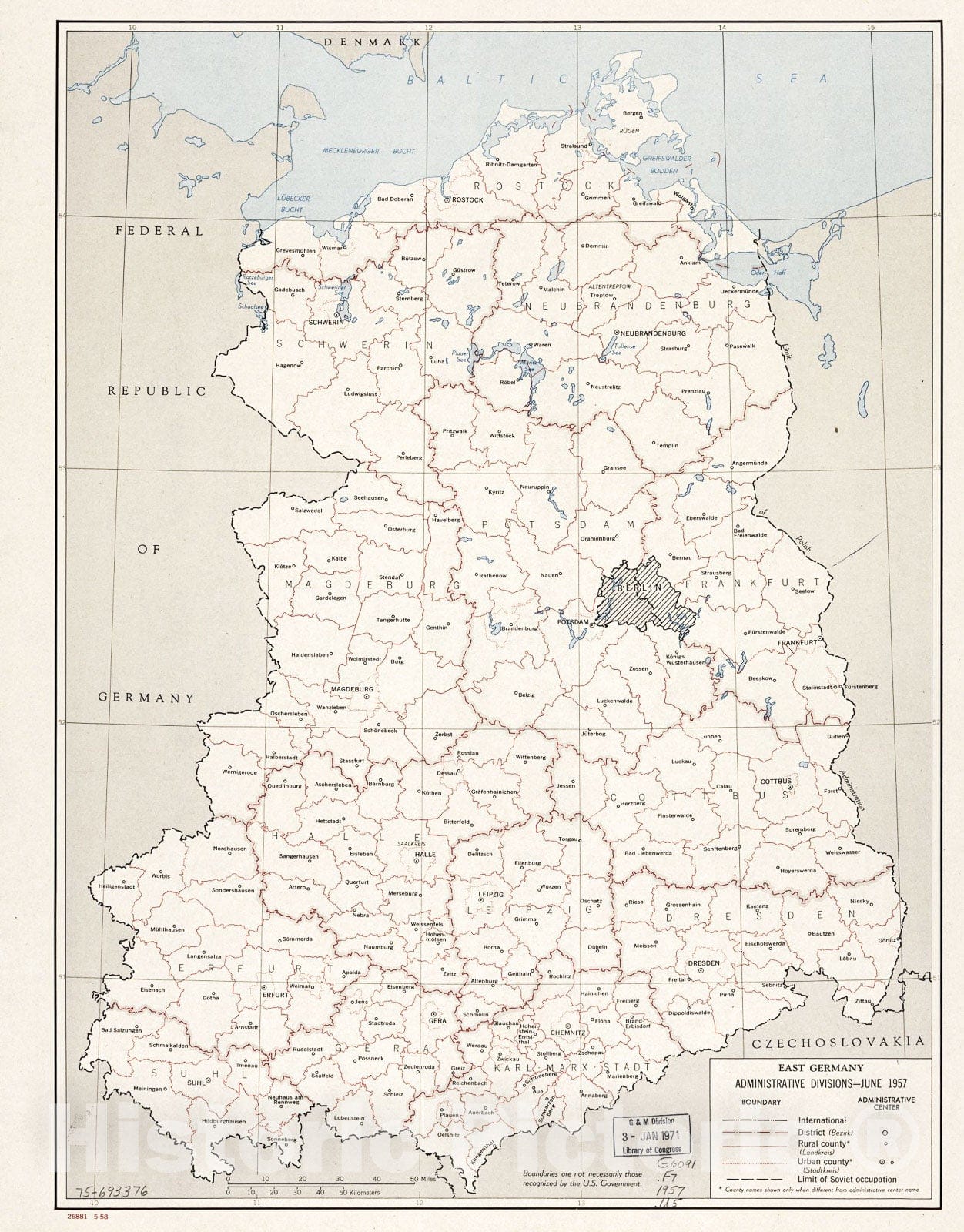 Historic 1958 Map - East Germany: Administrative divisions-June 1957. 5-58.