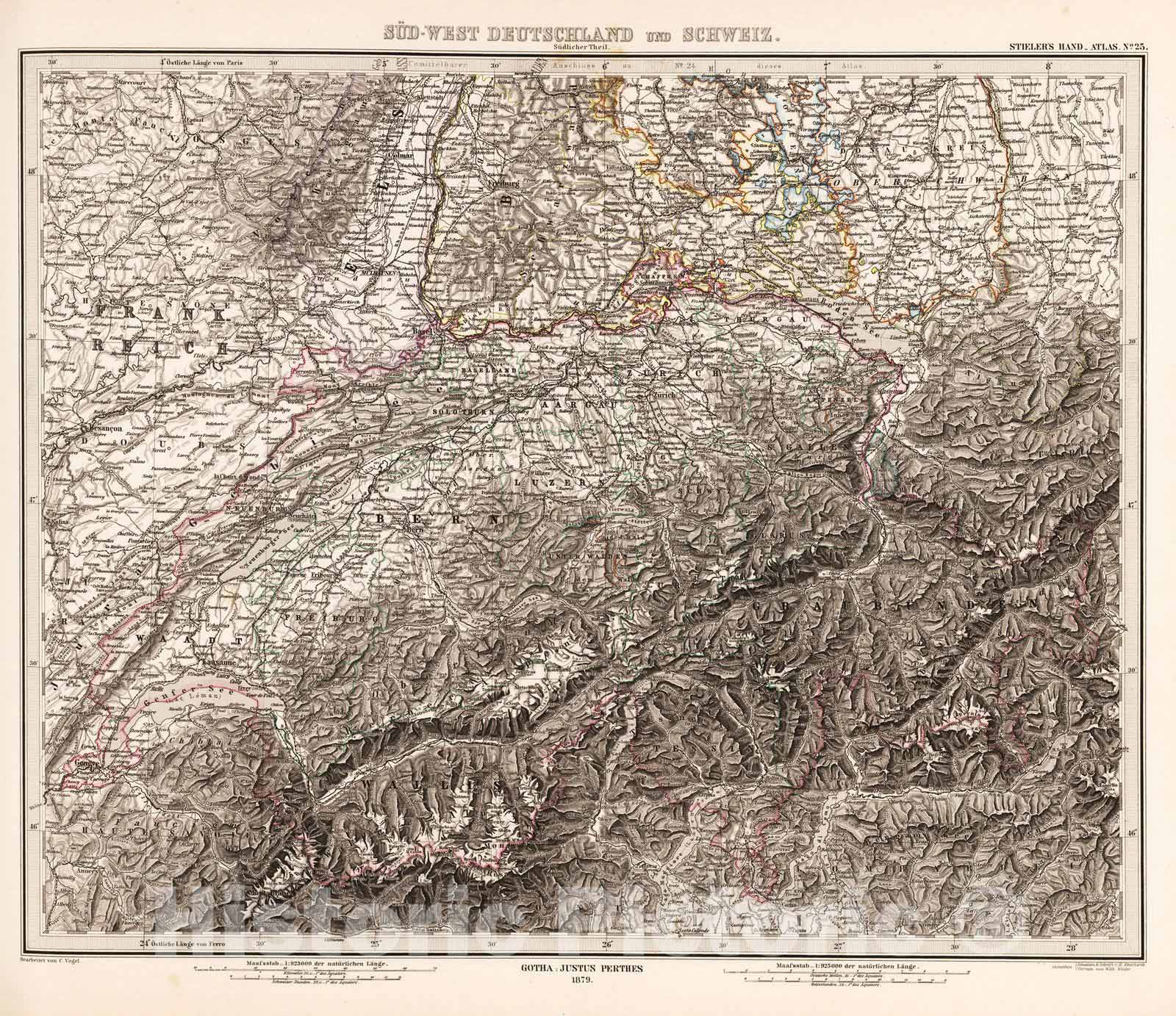• .Historic Map : 1879 Sud-West Deutchland und Schweiz. (Southwest Germany and Switzerland - Southern Sheet). - Vintage Wall Art