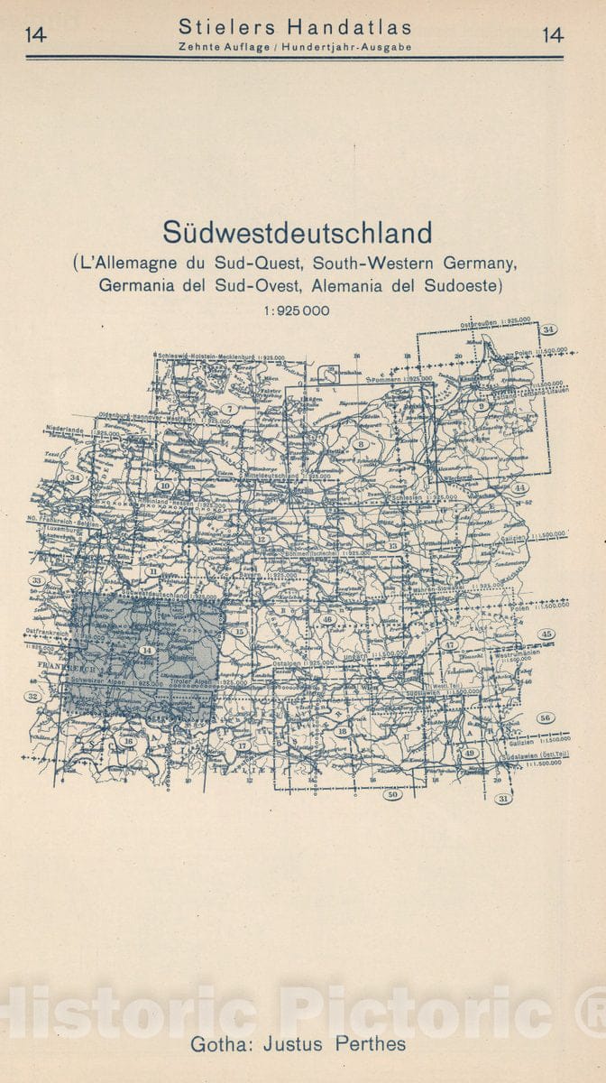 (Index Map) 14. Sudwestdeutschland. South-Western Germany. | Stieler's Atlas of Modern Geography. 254 Maps & Insets on 108 Sheets Engraved on Copper. Tenth (Centenary) Edition. Completely Revised & Largely Redrawn under the Direction of Professor H. Haack in Justus Perthes' Geogr. Institute. (in two parts). 1925. Gotha: Justus Perthes. | Publisher:Justus Perthes