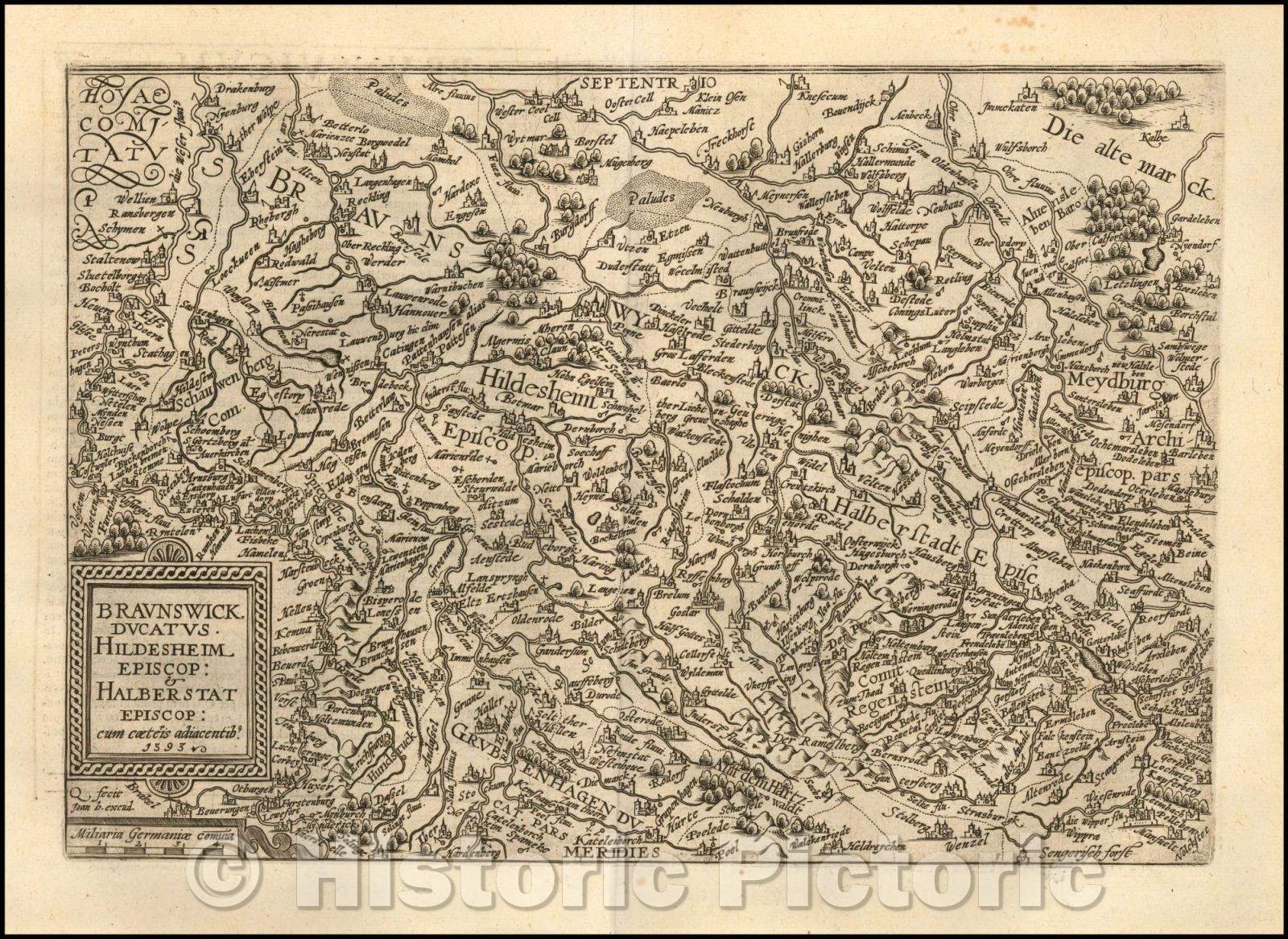 Historic Map - Braunswick Ducatus Hildesheim Episcop & Halberstat Episcop. cum caeteis adiacentibs/Map of the northeastern of Germany, 1593, Matthias Quad - Vintage Wall Art