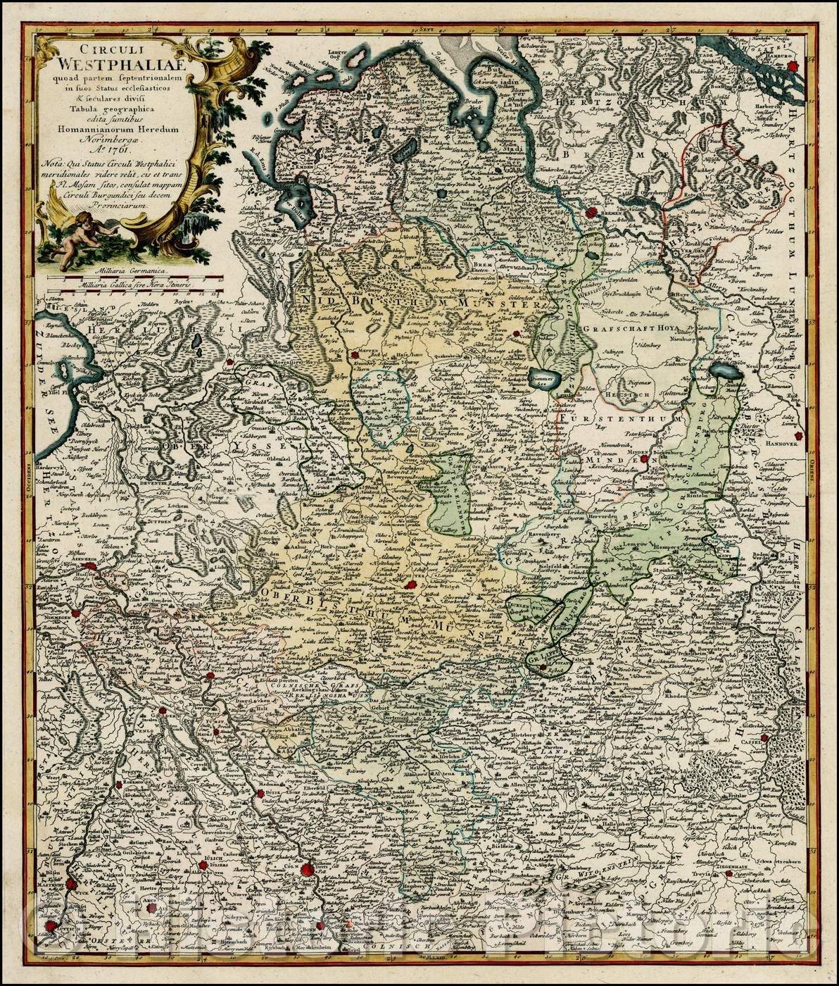 Historic Map - Circuli Westphaliae quoad partem Septentrionalem in :: suos Sttus ecclesias/Germany, Bremen and Hamburg,Cologne, Bonn, Dusseldorf, 1761 - Vintage Wall Art