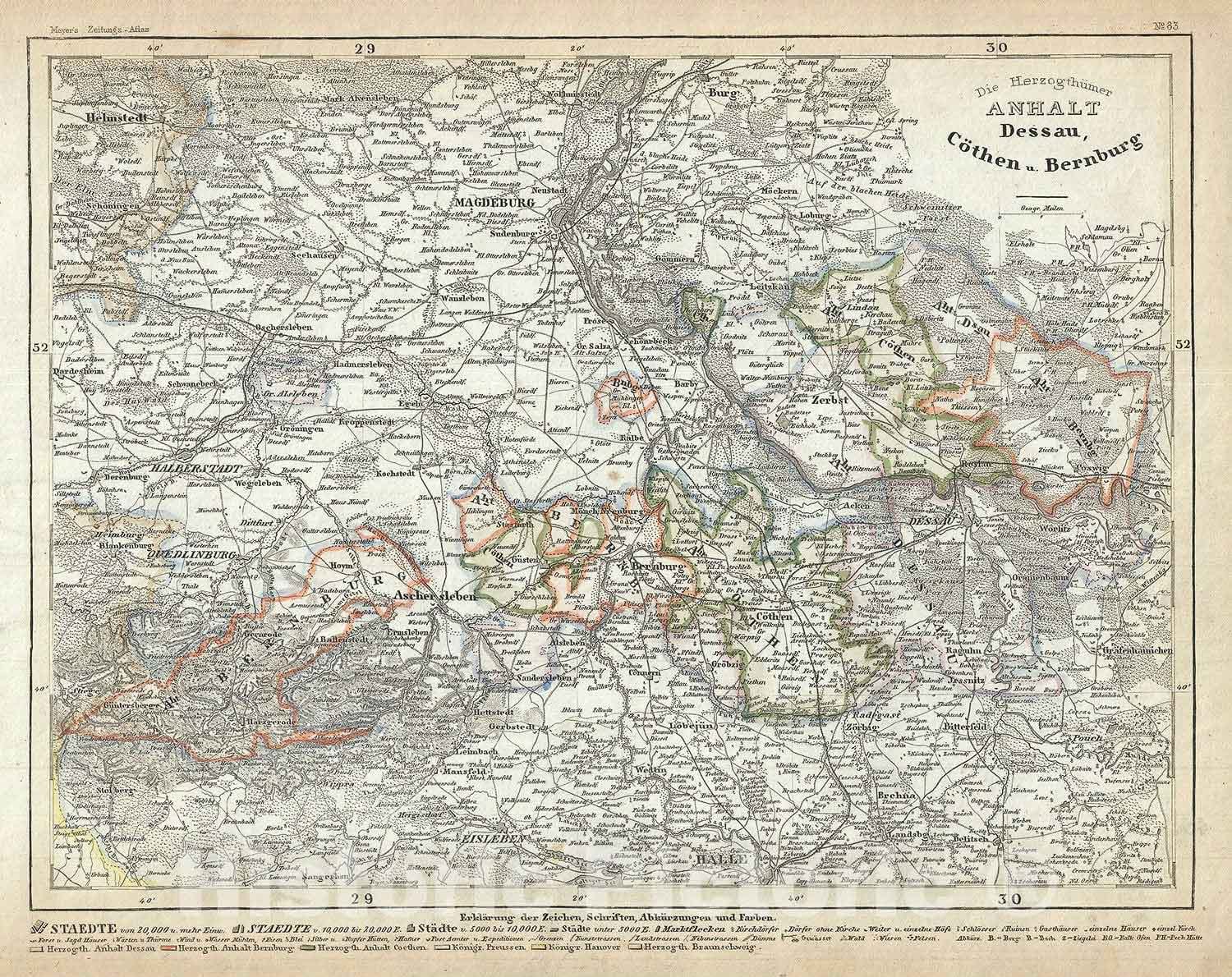 • .Historic Map : The Duchies of Anhalt Dessau, Anhalt Kothen and Anhalt, Saxony-Anhalt, Germany, Meyer, 1852, Vintage Wall Art