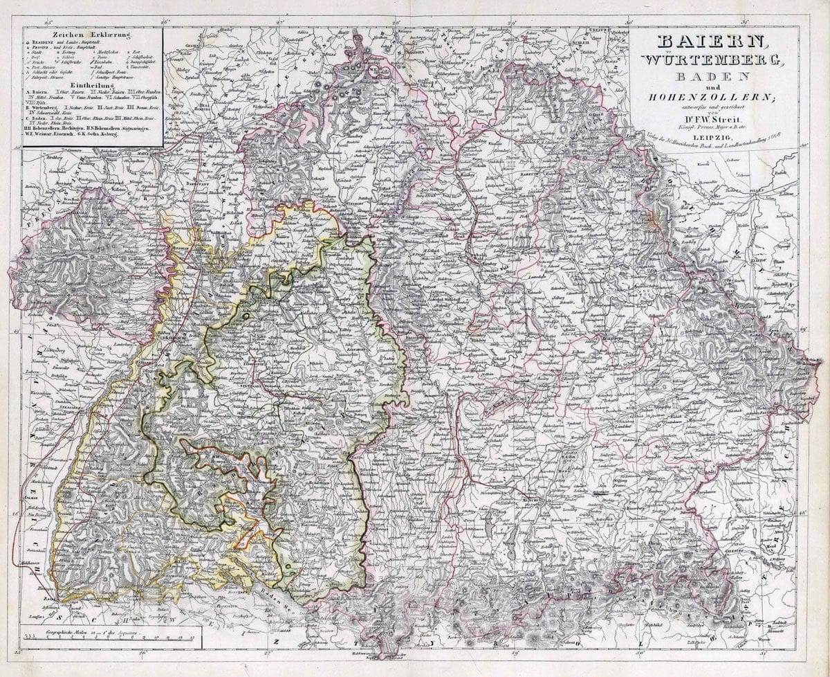 Historic Map : Germany, 1846 Baiern, Wurtemberg, Baden u. Hohenzollern , Vintage Wall Art