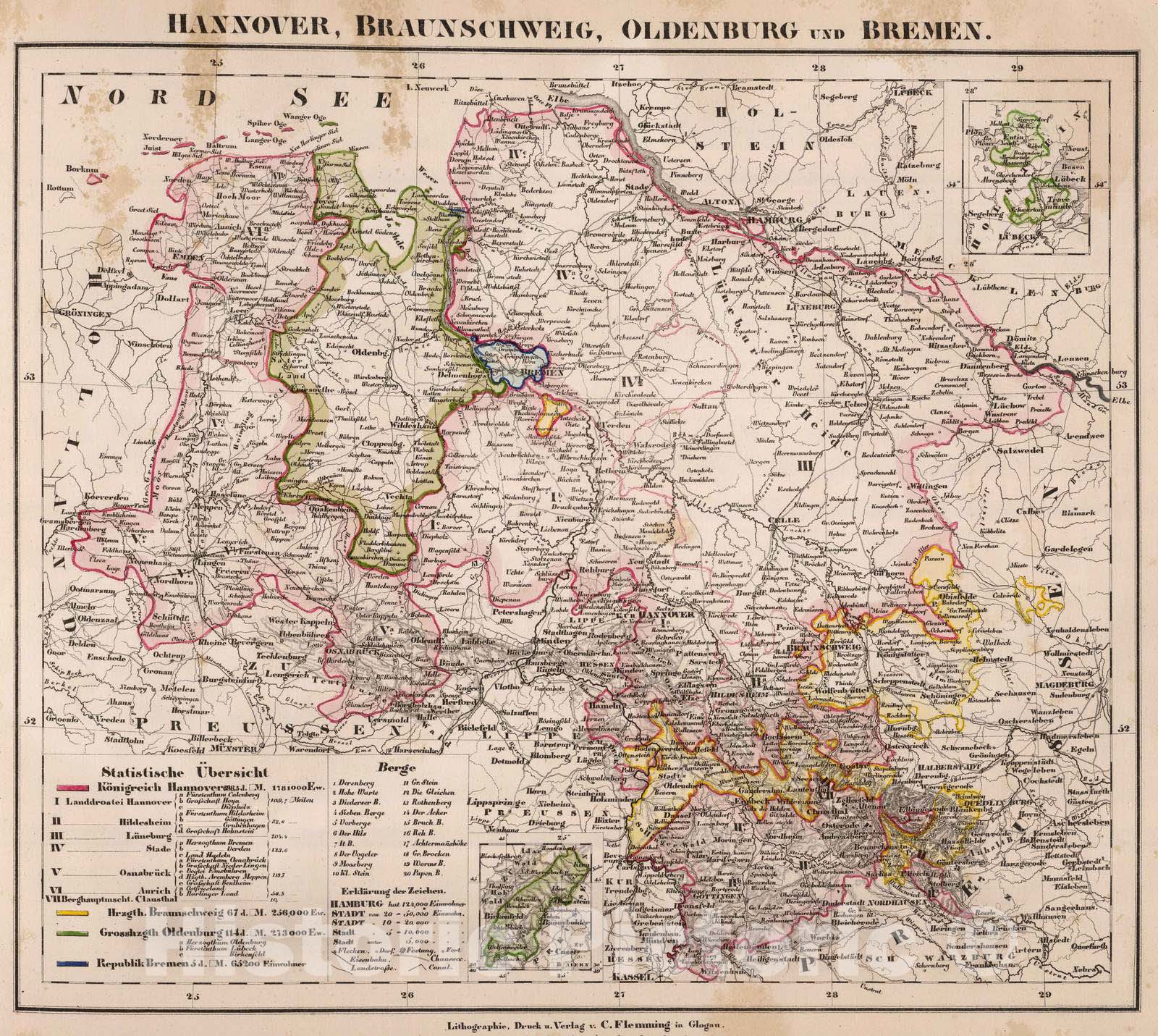 Germany, 1855 Hannover, Braunschweig, Oldenburg, Bremen. , Vintage Wall Art
