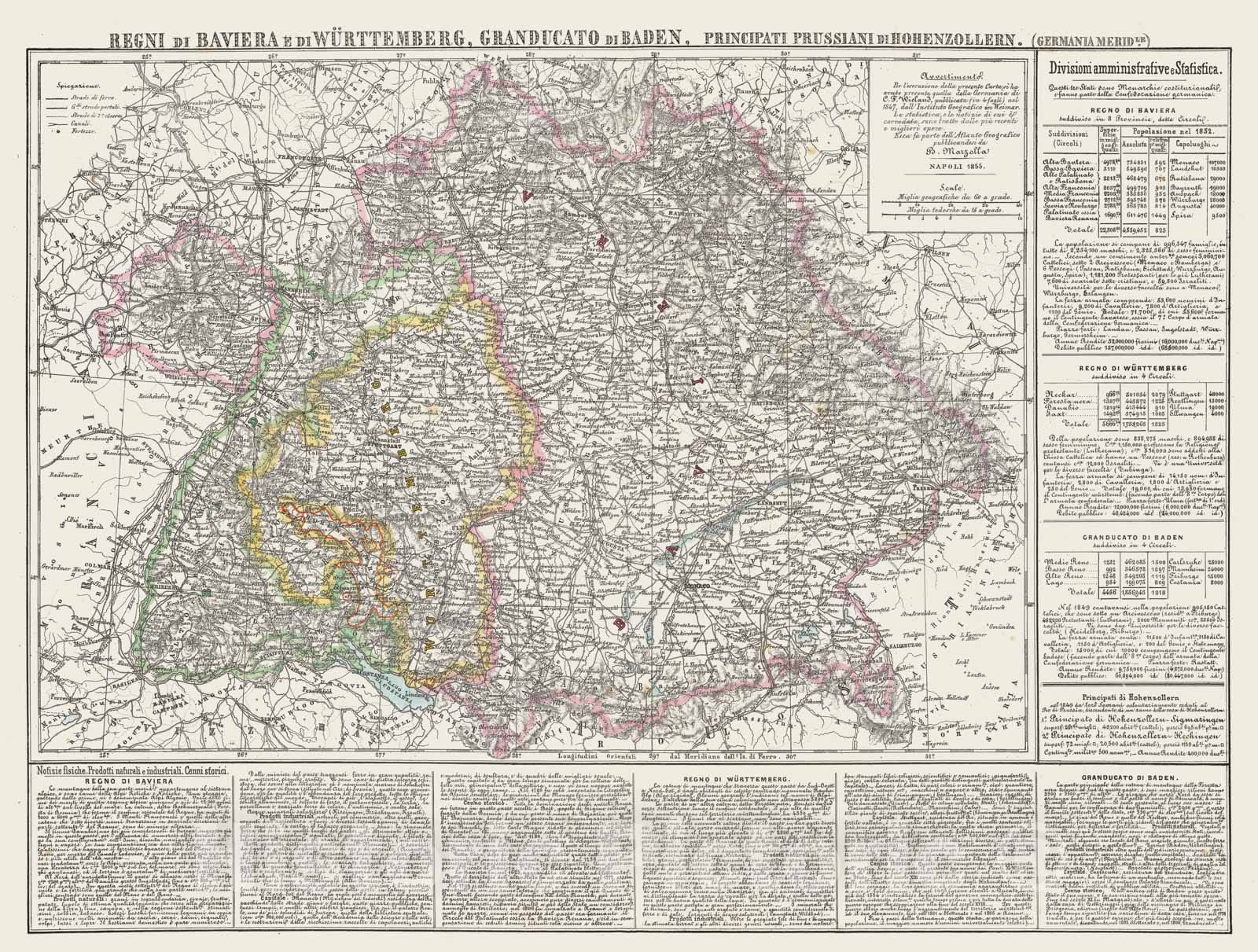 Historic Map : Germany, 1855 Regni di Baviera, Wurttemberg, Baden, Principati Prussiani. , Vintage Wall Art
