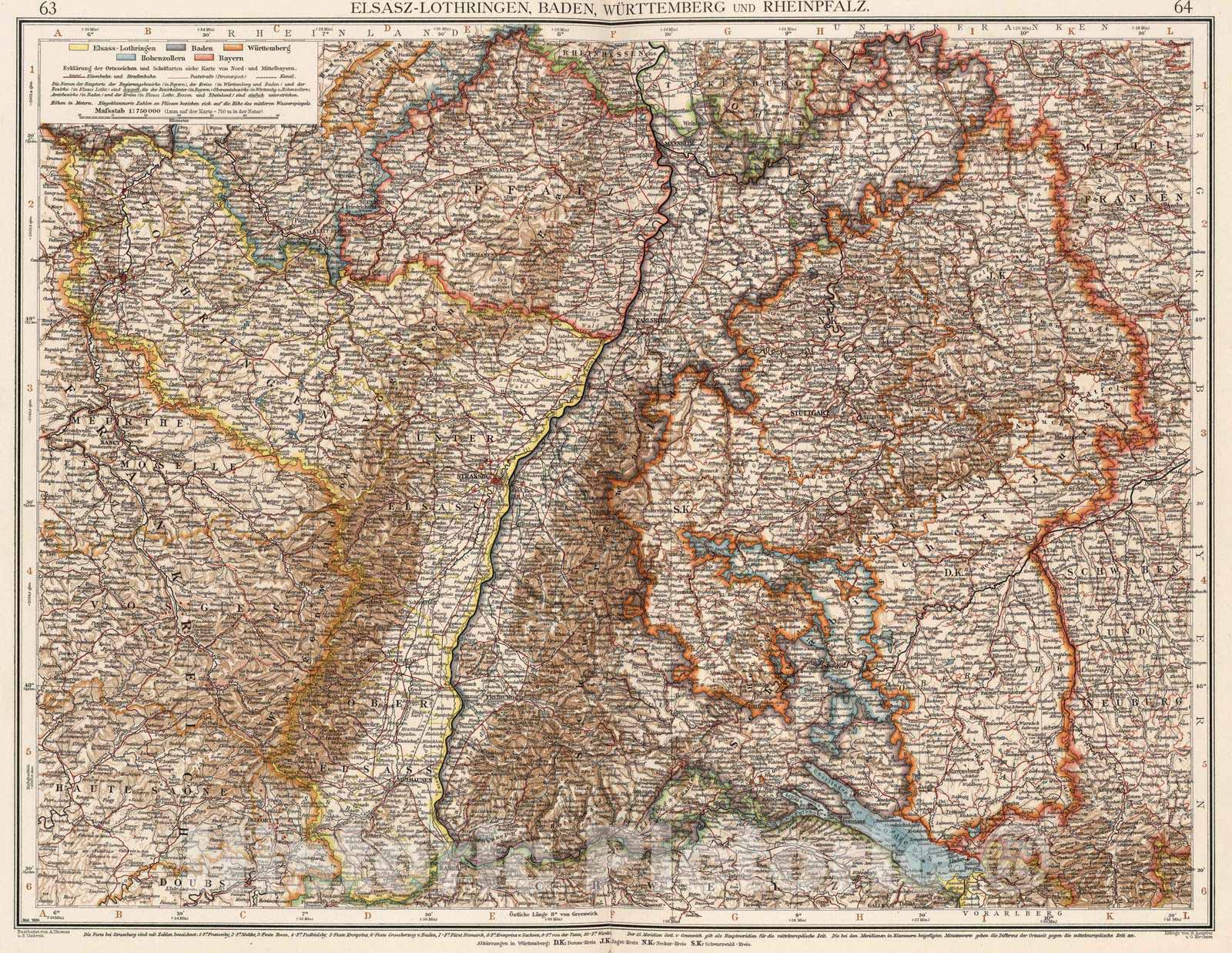 Historic Map : Germany, 1905 Elsasz-Lothringen, Baden, Wurttemberg und Rheinpfalz , Vintage Wall Art