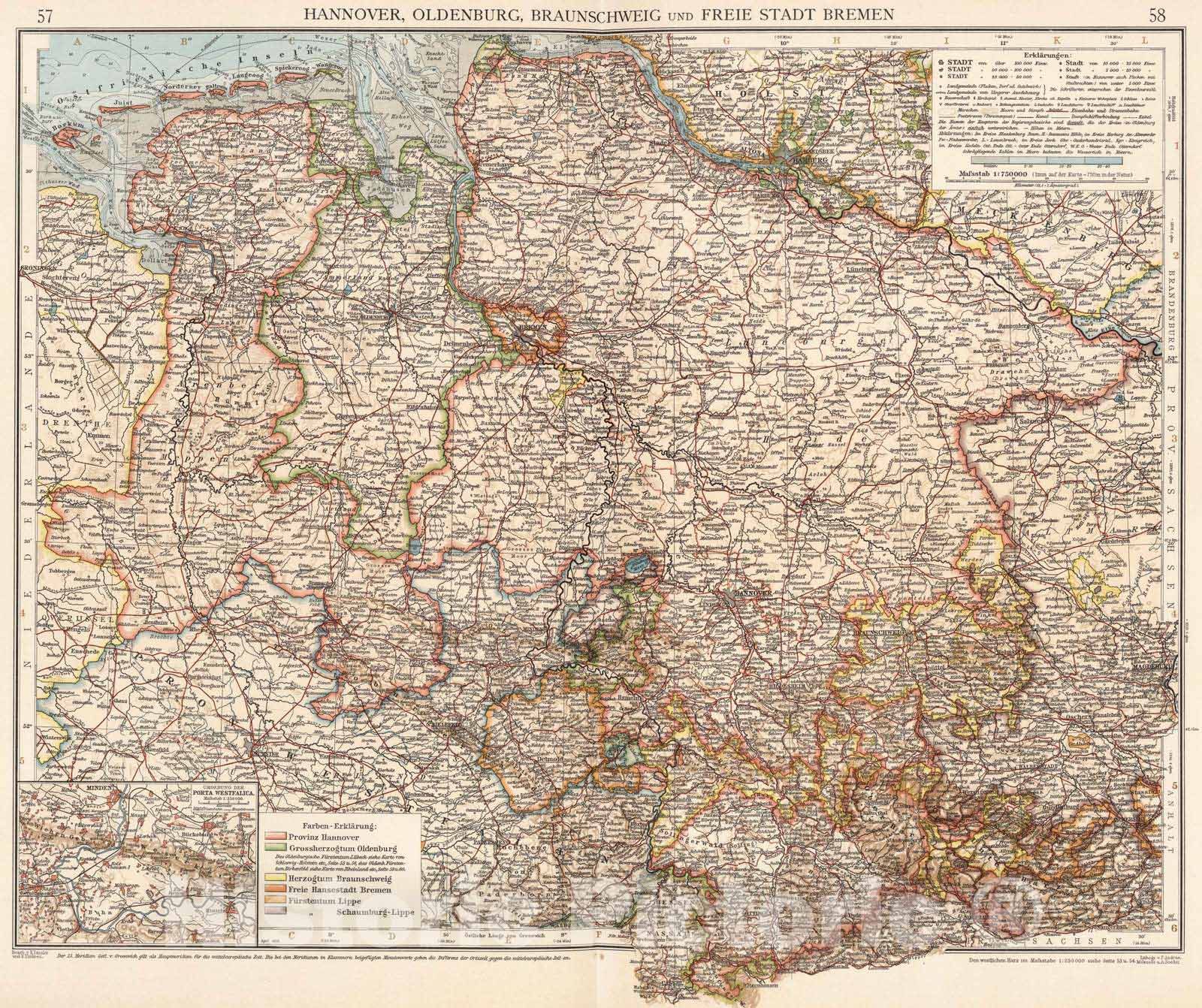• .Historic Map : Germany, 1905 Hannover, Oldengurg, Braunschweig und Freie Stadt Bremen , Vintage Wall Art