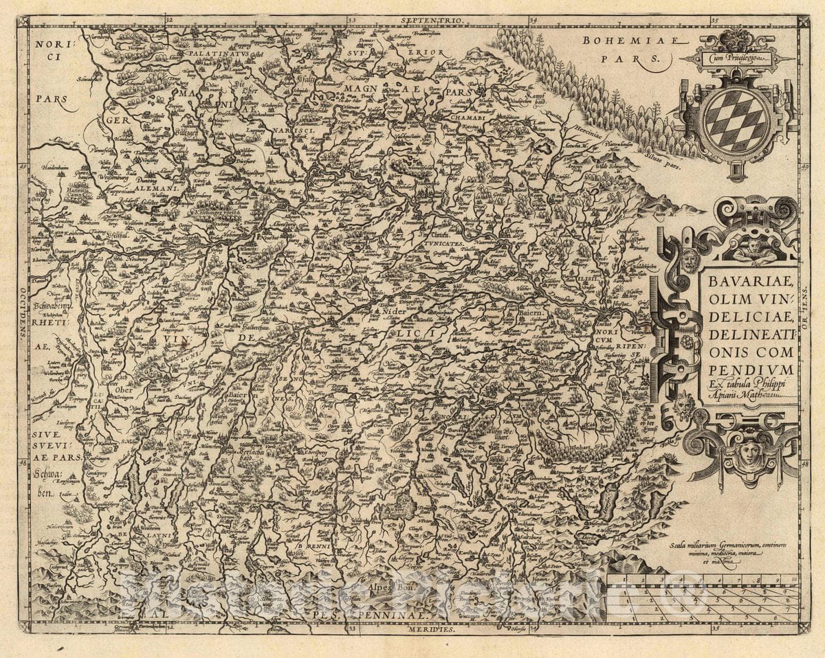 Historic Map : Germany, Bavaria , Germany Bavariae, Olim Vindeliciae, Delineationis Compendium Ex Tabula Philippi Apiani Math. Cum Privilegio, 1608 Atlas , Vintage Wall Art