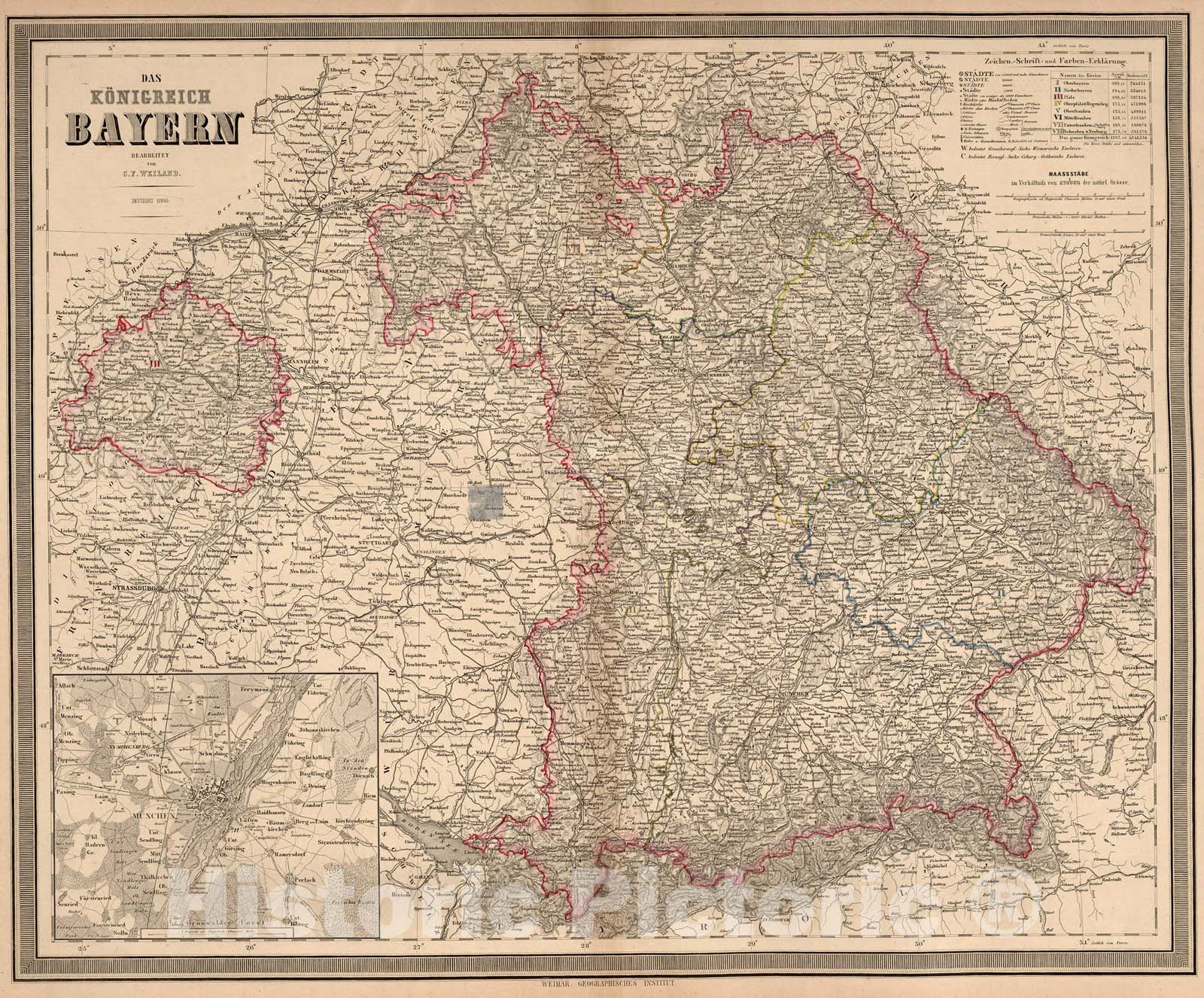 Das Konigreich Bayern. Bearbeitet von C.F. Weiland. Revidirt 1866. Weimar: Geographisches Institut. (with inset). (to accompany) Hand - Atlas Der Erde Und Des Himmels. | Hand - Atlas Der Erde Und Des Himmels. In siebzig Blattern. Zweiundvierzigste Auflage. Bearbeitet Von Dr. H. Kiepert, C. Graf, A. Graf Und Dr. C. Bruhns. Weimar, Geographisches Institut. | This 42nd edition is the first one in Which the brothers Carl and Adolf Graef are mentioned as the authors. Maps by H. Kiepert, Graf & Bruhns. Listed in Phillips under Kiepert. Many of the maps are now lithographed, although some are engraved, outline color, 70 � 57 or smaller. Covers are half leather black marbled paper covered boards. The atlas was published in installments, maps are dated from 1856 to 1867. The first map sheets Appeared in 1856. Copies from the years 1857-1860 were supplemented with maps from the 41st edition. The first 2 maps are world maps: the hemispheres and a world map in Mercator's projection. Followed by 3 thematic maps: two physical ones and a sheet of mountain profiles. Next are 2 maps of Europe, 23 maps of Austria and Germany, France printed in 4 sheets, and 19 maps of the other European countries, 5 maps of Asia, 4 of Africa, another 7 of the Americas and 2 of Australia/Oceania. The last 3 maps depict the northern and southern skies and the solar system, thereby justifying the title 'Hand-Atlas der Erde und des Himmels. No year is Mentioned on the title page. The publication year given (1867) is the year of the most recent maps of the atlas. The 42 edition was completed in 1861. In almost all of the years 1862-1869 revised printings of the 42nd edition were published, for example in which the Italian unification has been incorporated. In later printings - after the Austro-Prussian War in 1866 - the maps of Central Europe have a different order, where Germany precedes Austria.