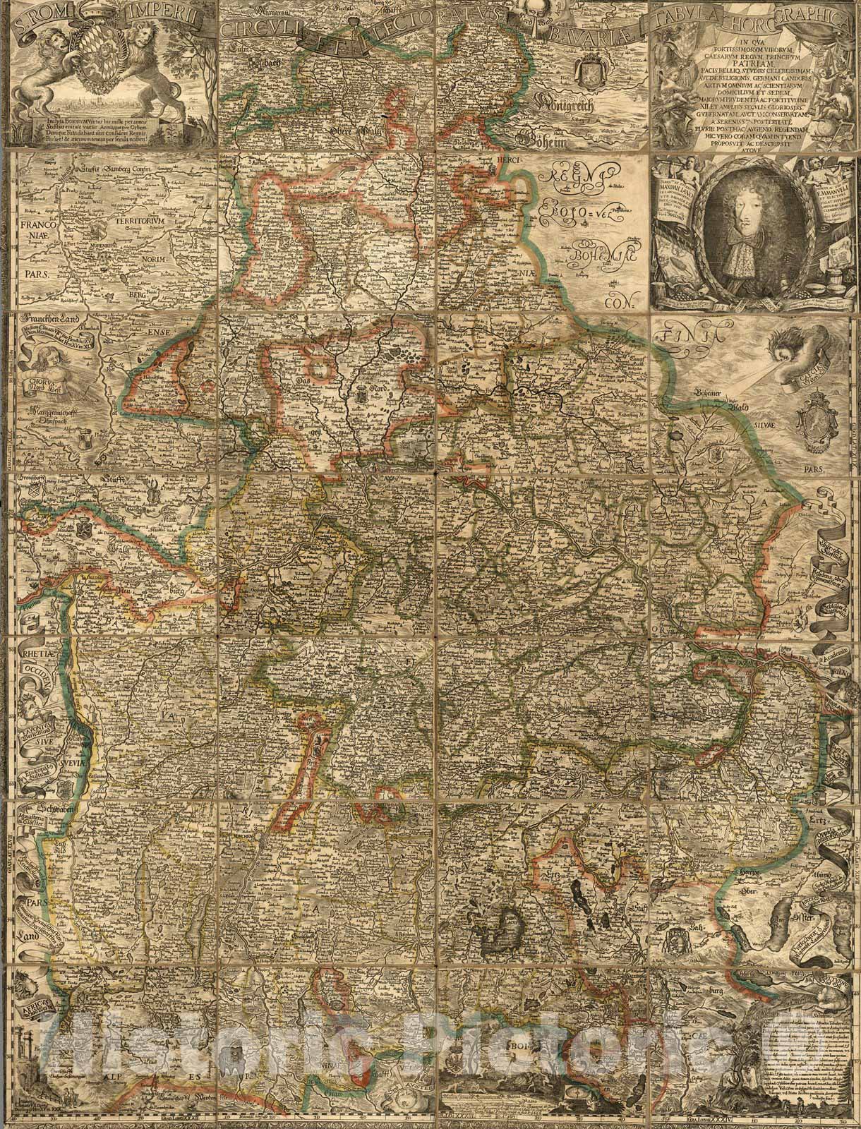 S. Rom. Imperii Circvli Et Electoratvs Bavariae Tabvla Chorographica : In Qua Fortissimorvm Virorvm, Caesarvm, Regum, Principum Patriam, Pacis, Belliq. Studiis Celeberrimam, Avitae Religionis, Germani Candoris, Artivm Omnivm Ac Scientiarvm Domicilivm Et Sedem, Maiorum Prudentia Ac Fortitvdine XII, Et Amplivs Secvlis Gloriosissimo Gvbernatam, Avctam, Conservatam, A Serenissima Posteritate, Plvrib. Posthac Avgend. Regendam, Hic Vero Coram Qvasi Intvend. Proposvit Ac Descripsit Atqve. Seren.mi et cels.mi principis ac D. De Alberti Sigismundi ..., Georg Philipp Finckh, inuenit ac fecit a.o 1663. | S. Rom. Imperii Circvli Et Electoratvs Bavariae Tabvla Chorographica : In Qua Fortissimorvm Virorvm, Caesarvm, Regum, Principum Patriam, Pacis, Belliq. Studiis Celeberrimam, Avitae Religionis, Germani Candoris, Artivm Omnivm Ac Scientiarvm Domicilivm Et Sedem, Maiorum Prudentia Ac Fortitvdine XII, Et Amplivs Secvlis Gloriosissimo Gvbernatam, Avctam, Conservatam, A Serenissima Posteritate, Plvrib. Posthac Avgend. Regendam, Hic Vero Coram Qvasi Intvend. Proposvit Ac Descripsit Atqve. Seren.mi et cels.mi principis ac D. De Alberti Sigismundi ..., Georg Philipp Finckh, inuenit ac fecit a.o 1663. | See note field above.