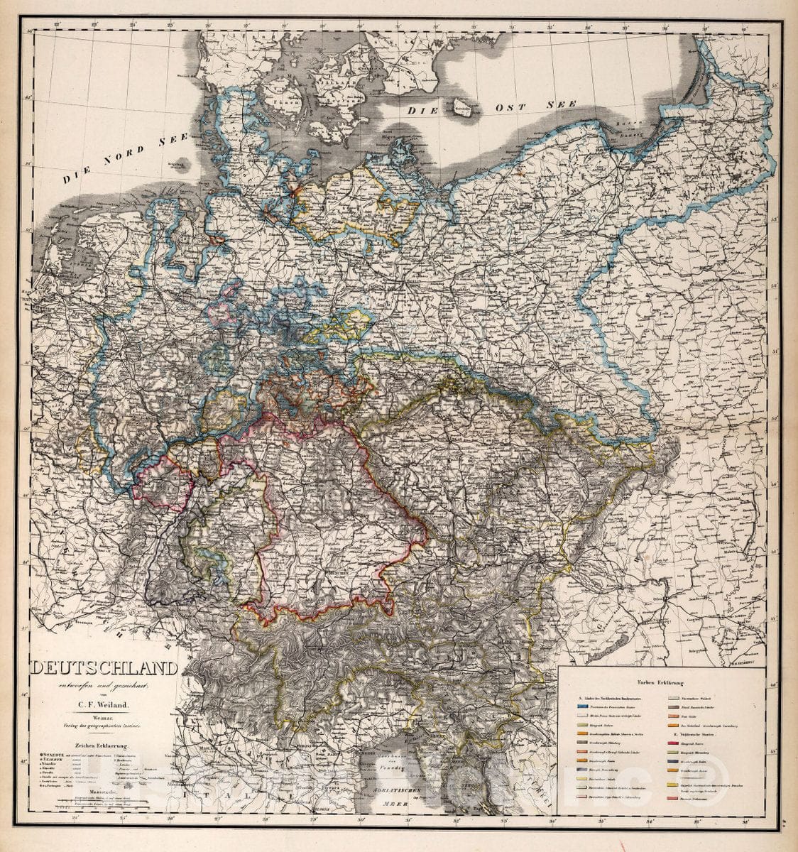 Historic Map : Germany, Deutschland. Entworfen und gezeichnet von C.F. Weiland. Verlag des Geographischen Instituts. Hand -Der Erde Und Des Himmels, 1866 , Vintage Wall Art