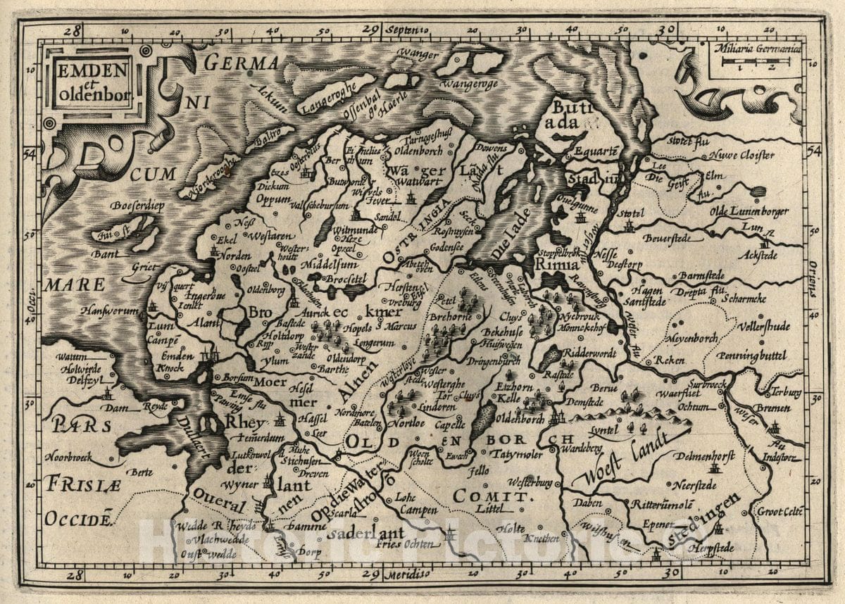 • Historic Map : Germany, Emden et Oldenbor.(to accompany) Atlas Minor Gerardi Mercatoris, 1607 Atlas , Vintage Wall Art