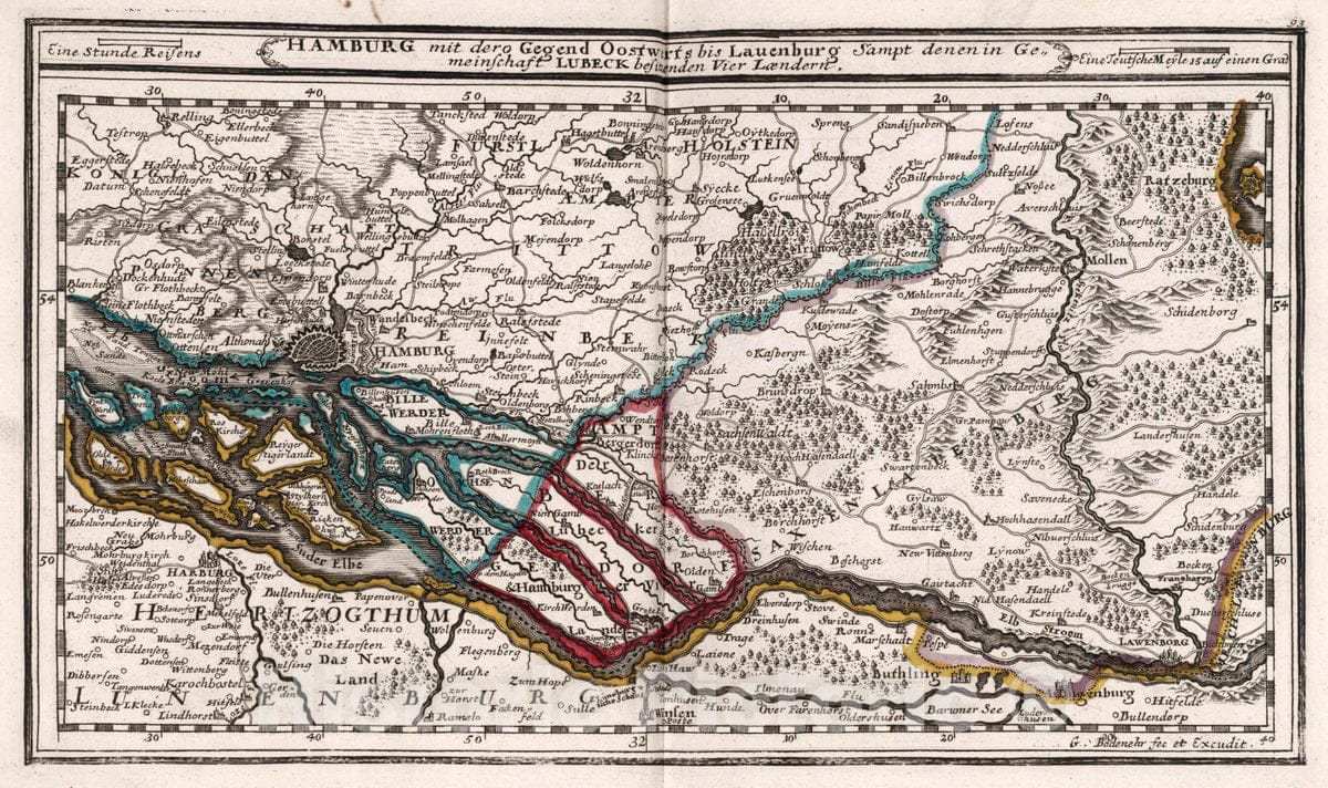 Historic Map : Germany, , Europe 1716 Hamburg mit dero Gegend Oostwerts bis Lauenburg , Vintage Wall Art