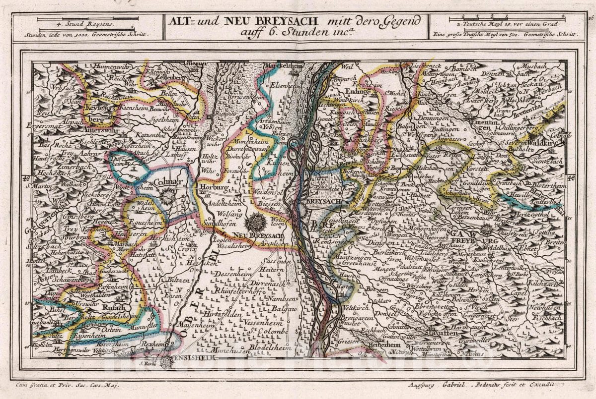 • .Historic Map : Germany, , Europe Alt- und Neu Breysach mitt dero Gegend auff 6. Stunden inca, 1716 Atlas , Vintage Wall Art