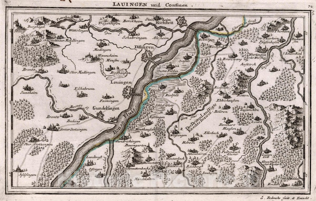 • .Historic Map : Germany, , Europe Lauingen und Confinen. G. Bodenehr fecit et Excudit. (to accompany)Curieux Oder Neuer und Compendieuser Atlas. 72, 1716, Vintage Wall Art