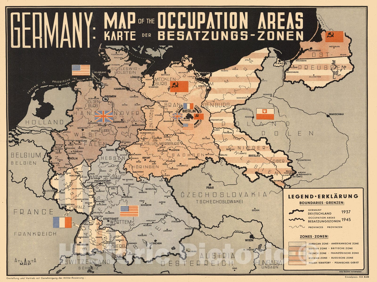 Historic Map : Germany, Germany: Map of The Occupation Areas. Carte der Besatzungs - Zonen, 1945 , Vintage Wall Art