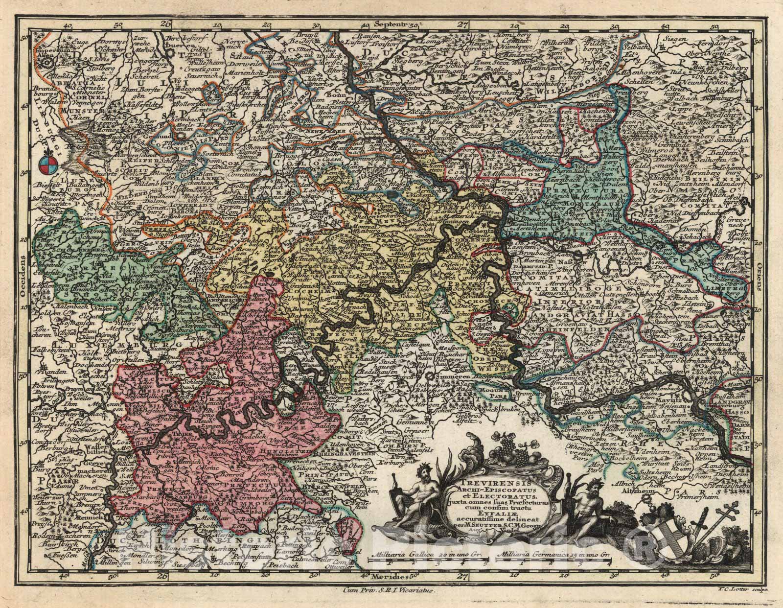 Trevirensis Archi-Episcopatus et Electoratus : iuxta omnes suas Praefecturas cum confini tractu Eyfaliae accuratissime delineat. per M. Seutter S.C. Mai. Geogr. Aug. Vindel. Cum Priv. S.R.I. Vicariat. Tob. Con. Lotter, sculps. (to accompany) Atlas minor praecipua orbis terrarum imperia. | Atlas minor praecipua orbis terrarum imperia, Regna et Provincias, Germaniae Potissimum, tabellis 50 exacte declineatis sistens usui militiae ducum ac peregrinantium maxime accomodatus opera Matthaei Seutteri, Sac. Caes. Maj. Geogr. Aug. Vind. Jacob Christoph Weyerman ... Cum Privileg: S.R.I. Vicariat. in part: Rheni, Franc: et Suev Juris. Martin Gottfried Crophius Sculps. | Atlas minor: Special World empires, kingdoms and provinces, Germany, etc., with 59 copper plate outline and full color maps. World map bound upside down. Date of publication from: Tooley, R.V. Dict. of mapmakers. Drawn by Jacob Christoph Weyerman, engraved by Albrecht Seutter, Andrea Silbereisen, Tobias Lotter, Matthaeus Lainpacher and Martin Gottfried Crophius. Numbered manuscript index at the front written in French. Tucked into the atlas is a folded circular celestial map of the southern hemisphere. Includes a map of Genoa not listed in the index. Each map shows one or more cartouches with figures, animals etc. Bound in Bound in marble papered, half leather covers with no title on cover.