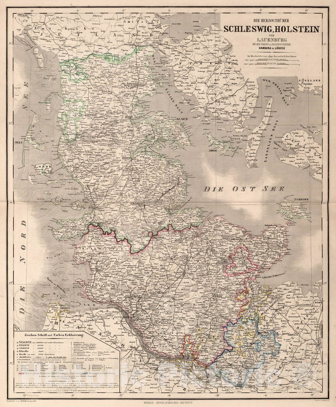 Historic Map : Germany, Schleswig-Holstein , GermanyDie Herzogthumer Schleswig, Holstein und Lauenburg 1864 , Vintage Wall Art