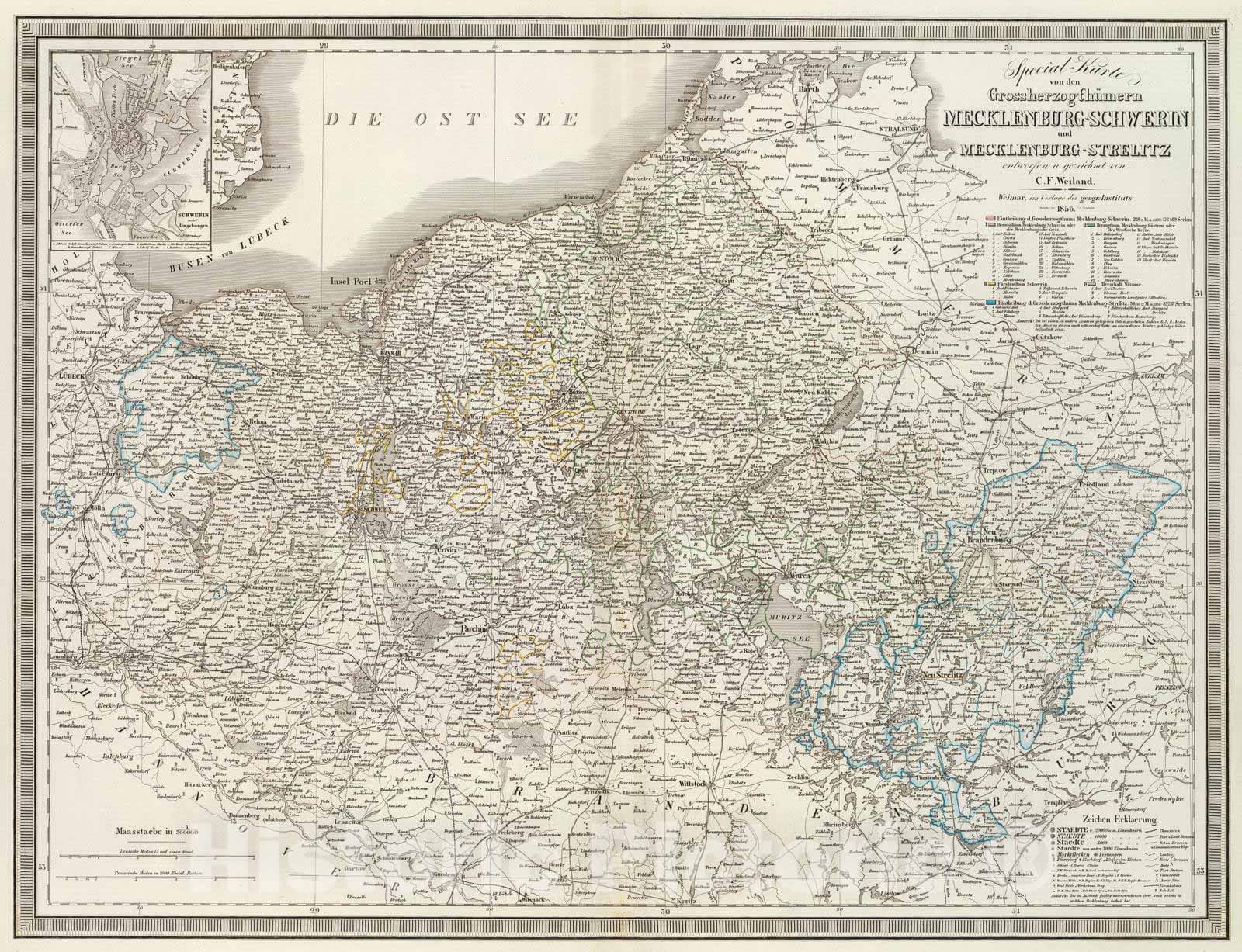 Historic Map : Germany, Schwerin Region (Mecklenburg-Vorpommern, Germany) 1856 Mecklenburg-Schwerin, Mecklenburg-Strelitz. , Vintage Wall Art