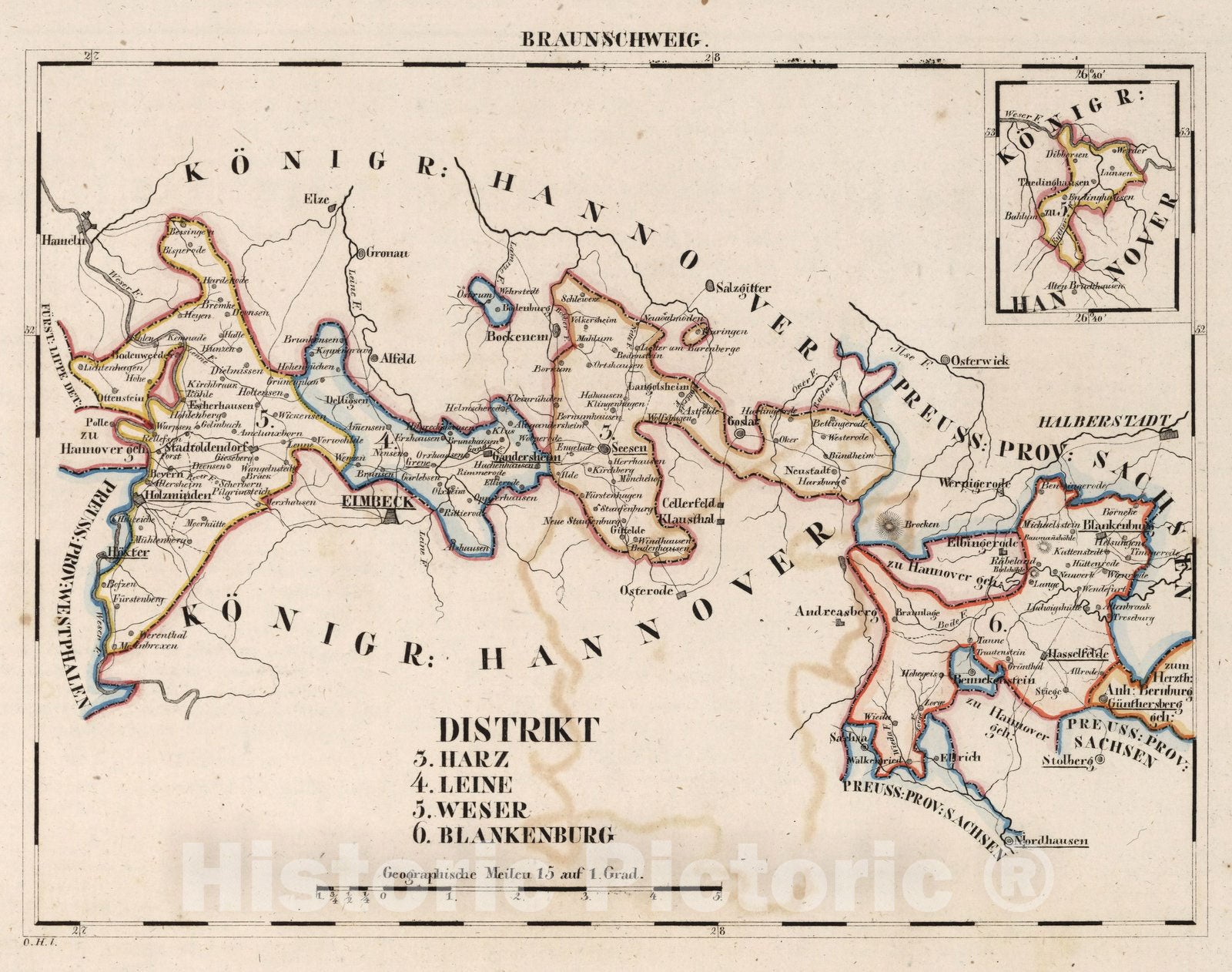 Braunschweig. 1. Distrikt: 3.Harz. 4. Leine. 5. Weser. 6. Blankenburg. (to accompany) Atlas von Europa nebst den Kolonien ... bearbeitet von W. E. A. v. Schlieben ... Leipzig bei Georg Joachim Goschen 1825. (inset) Konigr: Hanover. | Atlas von Europa nebst den Kolonien : fur Geschaftsmanner, Zeitungsleser und Besitzer des Conversations-Lexicons in einer Folge von Charten und einem alphabetisch eingerichteten Texte : bearbeitet von W. E. A. v. Schlieben ... Leipzig bei Georg Joachim Goschen 1825. O. Hermann, Lith. | Early topographical map of Europe, together with the colonies for businessmen, newspaper readers ... by German geographical author, Wilhelm August von Schlieben (1781-1839), published in parts from 1825-1830, in 3 volumes, and 15 parts; volume 1: 1-5, Volume 2: 6-10, Volume 3: 11-15. Each volume includes outline hand colored maps, manuscript index, forward, table of content, extensive descriptive text and index. Bound in half leather green marbled paper covered boards measuring 26.5x34.5, with "Atlas von Europa ... Lieferung" embossed on the spine. (v.1) 1. lief. Konigreich Frankreich. I. Heft. 2. lief. Konigreich Frankreich. II. heft. und das Turkische (Osmanische) reich in Europa. 3. lief. Die Helvetische eldgenossenschaft oder die Schweiz und das konigreich Portugal. 4. lief. Das konigreich Spanien. 5. lief. Die konigreiche 1) der Niederlands 2) Danemark. und 3) Schweden mit Norwegen.--(v.2) 6. lief. Der deutsche staatebund und zwar die suddeutschen staaten. 7. lief. Der deutsche staatenbund, und zwar der nordwestliche theil der nordeutschen staaten. 8. lief. Der deutsche staatenbund. und zwar der nordostliche theil der norddeutschen staaten. 9.-10. lief. Der Preussische staat.--(v.3) 11-12. lief. Der Osterreichische staat oder das kaiserthum Oesterreich. 13. lief. Das Russische reich in Europa mit ausschiuss von Polen. 14. lief. Das konigreich Polen, die republik Krakau, die Italienischen staaten. 15. lief. Das Britische reich.