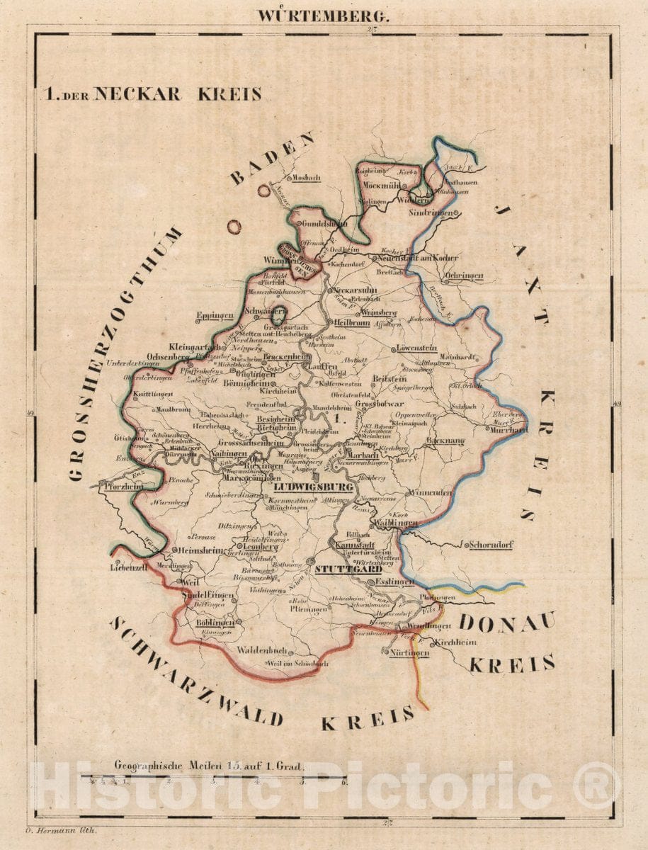 Wurtemberg. 1. Der Neckar Kreis. O. Hermann, Lith. (to accompany) Atlas von Europa nebst den Kolonien ... bearbeitet von W. E. A. v. Schlieben ... Leipzig bei Georg Joachim Goschen 1825. | Atlas von Europa nebst den Kolonien : fur Geschaftsmanner, Zeitungsleser und Besitzer des Conversations-Lexicons in einer Folge von Charten und einem alphabetisch eingerichteten Texte : bearbeitet von W. E. A. v. Schlieben ... Leipzig bei Georg Joachim Goschen 1825. O. Hermann, Lith. | Publisher:Georg Joachim Goschen