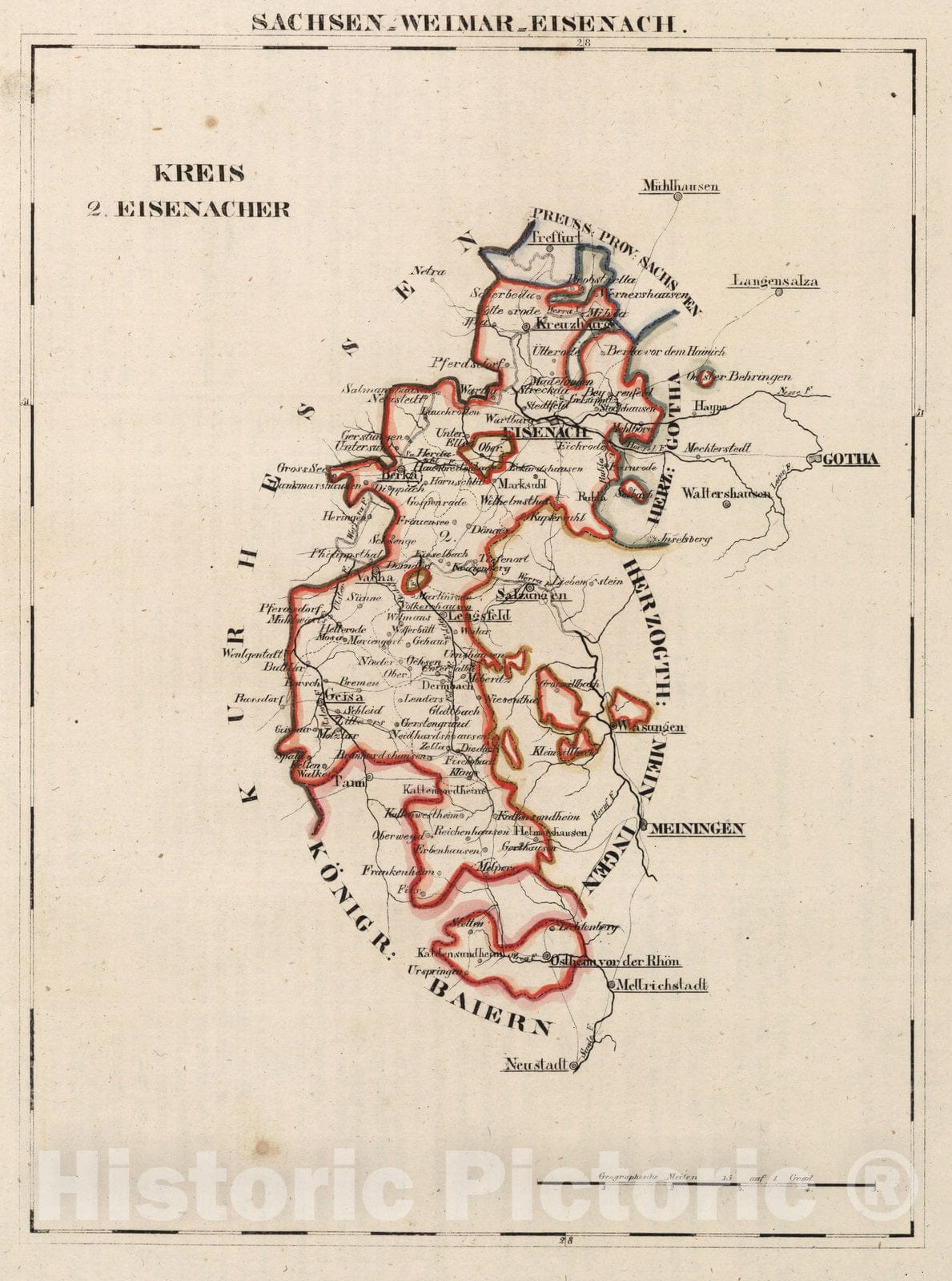 Sachsen - Weimar - Eisenach. Kreis. 2. Eisenacher. (to accompany) Atlas von Europa nebst den Kolonien ... bearbeitet von W. E. A. v. Schlieben ... Leipzig bei Georg Joachim Goschen 1825. | Atlas von Europa nebst den Kolonien : fur Geschaftsmanner, Zeitungsleser und Besitzer des Conversations-Lexicons in einer Folge von Charten und einem alphabetisch eingerichteten Texte : bearbeitet von W. E. A. v. Schlieben ... Leipzig bei Georg Joachim Goschen 1825. O. Hermann, Lith. | Early topographical map of Europe, together with the colonies for businessmen, newspaper readers ... by German geographical author, Wilhelm August von Schlieben (1781-1839), published in parts from 1825-1830, in 3 volumes, and 15 parts; volume 1: 1-5, Volume 2: 6-10, Volume 3: 11-15. Each volume includes outline hand colored maps, manuscript index, forward, table of content, extensive descriptive text and index. Bound in half leather green marbled paper covered boards measuring 26.5x34.5, with "Atlas von Europa ... Lieferung" embossed on the spine. (v.1) 1. lief. Konigreich Frankreich. I. Heft. 2. lief. Konigreich Frankreich. II. heft. und das Turkische (Osmanische) reich in Europa. 3. lief. Die Helvetische eldgenossenschaft oder die Schweiz und das konigreich Portugal. 4. lief. Das konigreich Spanien. 5. lief. Die konigreiche 1) der Niederlands 2) Danemark. und 3) Schweden mit Norwegen.--(v.2) 6. lief. Der deutsche staatebund und zwar die suddeutschen staaten. 7. lief. Der deutsche staatenbund, und zwar der nordwestliche theil der nordeutschen staaten. 8. lief. Der deutsche staatenbund. und zwar der nordostliche theil der norddeutschen staaten. 9.-10. lief. Der Preussische staat.--(v.3) 11-12. lief. Der Osterreichische staat oder das kaiserthum Oesterreich. 13. lief. Das Russische reich in Europa mit ausschiuss von Polen. 14. lief. Das konigreich Polen, die republik Krakau, die Italienischen staaten. 15. lief. Das Britische reich.