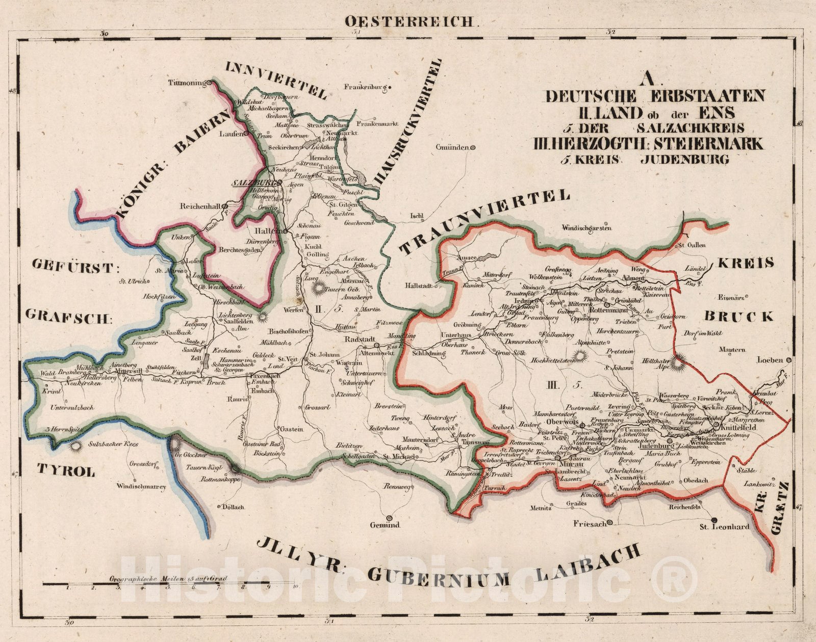Historic Map : Germany, V.3:11-15:XI:1. Oesterreich. A. Deutsche Erbstaaten II. Land ob der Ens. 1828 , Vintage Wall Art