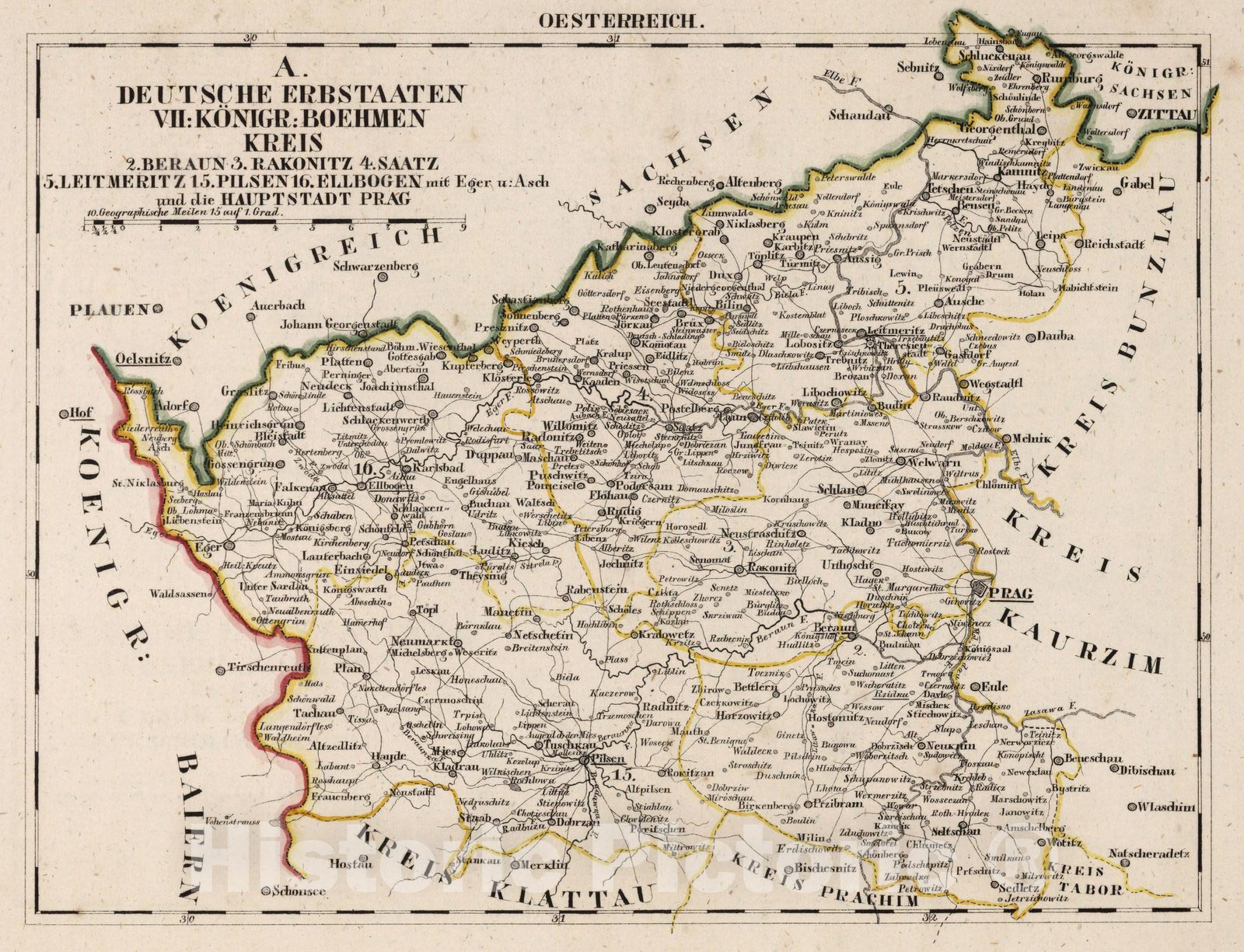 Oesterreich. A. Deutsche Erbstaaten. VII. Konigr: Bohmen Kreis ... (to accompany) Atlas von Europa nebst den Kolonien. Leipzig bei Georg Joachim Goschen 1828. | Atlas von Europa nebst den Kolonien : fur Geschaftsmanner, Zeitungsleser und Besitzer des Conversations-Lexicons in einer Folge von Charten und einem alphabetisch eingerichteten Texte : bearbeitet von W. E. A. v. Schlieben ... Leipzig bei Georg Joachim Goschen 1825. O. Hermann, Lith. | Early topographical map of Europe, together with the colonies for businessmen, newspaper readers ... by German geographical author, Wilhelm August von Schlieben (1781-1839), published in parts from 1825-1830, in 3 volumes, and 15 parts; volume 1: 1-5, Volume 2: 6-10, Volume 3: 11-15. Each volume includes outline hand colored maps, manuscript index, forward, table of content, extensive descriptive text and index. Bound in half leather green marbled paper covered boards measuring 26.5x34.5, with "Atlas von Europa ... Lieferung" embossed on the spine. (v.1) 1. lief. Konigreich Frankreich. I. Heft. 2. lief. Konigreich Frankreich. II. heft. und das Turkische (Osmanische) reich in Europa. 3. lief. Die Helvetische eldgenossenschaft oder die Schweiz und das konigreich Portugal. 4. lief. Das konigreich Spanien. 5. lief. Die konigreiche 1) der Niederlands 2) Danemark. und 3) Schweden mit Norwegen.--(v.2) 6. lief. Der deutsche staatebund und zwar die suddeutschen staaten. 7. lief. Der deutsche staatenbund, und zwar der nordwestliche theil der nordeutschen staaten. 8. lief. Der deutsche staatenbund. und zwar der nordostliche theil der norddeutschen staaten. 9.-10. lief. Der Preussische staat.--(v.3) 11-12. lief. Der Osterreichische staat oder das kaiserthum Oesterreich. 13. lief. Das Russische reich in Europa mit ausschiuss von Polen. 14. lief. Das konigreich Polen, die republik Krakau, die Italienischen staaten. 15. lief. Das Britische reich.
