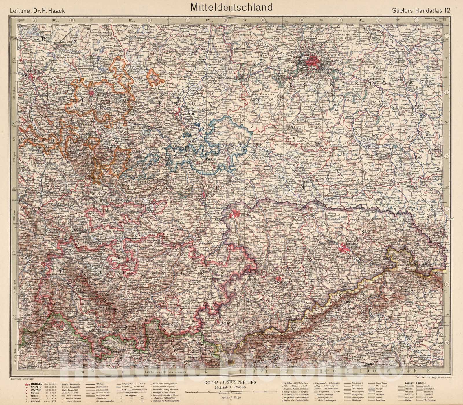 12. Mitteldeutschland. Central Germany. | Stieler's Atlas of Modern Geography. 254 Maps & Insets on 108 Sheets Engraved on Copper. Tenth (Centenary) Edition. Completely Revised & Largely Redrawn under the Direction of Professor H. Haack in Justus Perthes' Geogr. Institute. (in two parts). 1925. Gotha: Justus Perthes. | Two volume set in English. 10th edition and the Centenary edition. This edition was a very important revision and was issued in German, French, English, Spanish, and Italian. Each map preceded by index map, printed in blue, which is labeled, "Stielers Handatlas, Zehnte Auflage / Hundertjahr-Ausgabe. Gotha: Justus Perthes." Relief shown in hachures. Alphabetical Index of place names not scanned. Over 43 different draftsmen and engravers are listed on the various sheets.