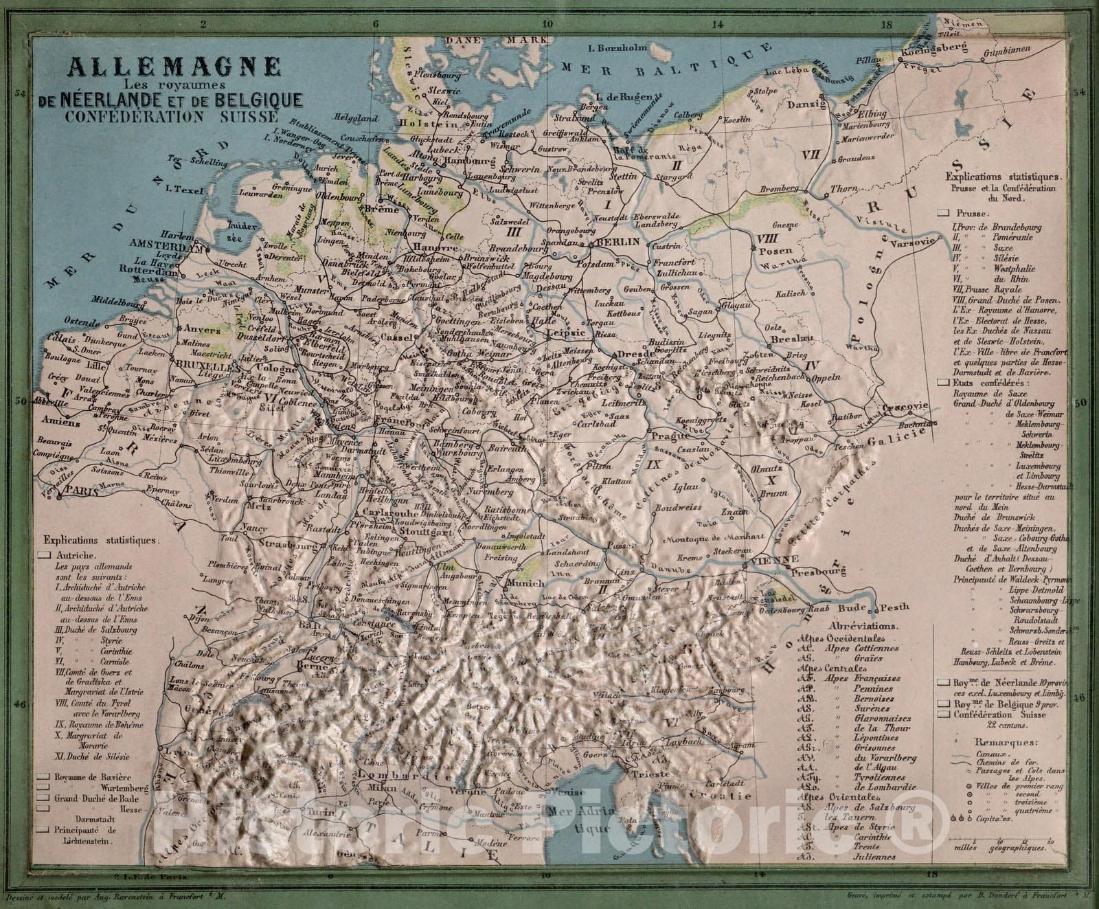 • .Historic Map : Germany,Allemagne Les royaumes de Neerlande et de Belgique Confederation Suisse 1865 v2 , Vintage Wall Art
