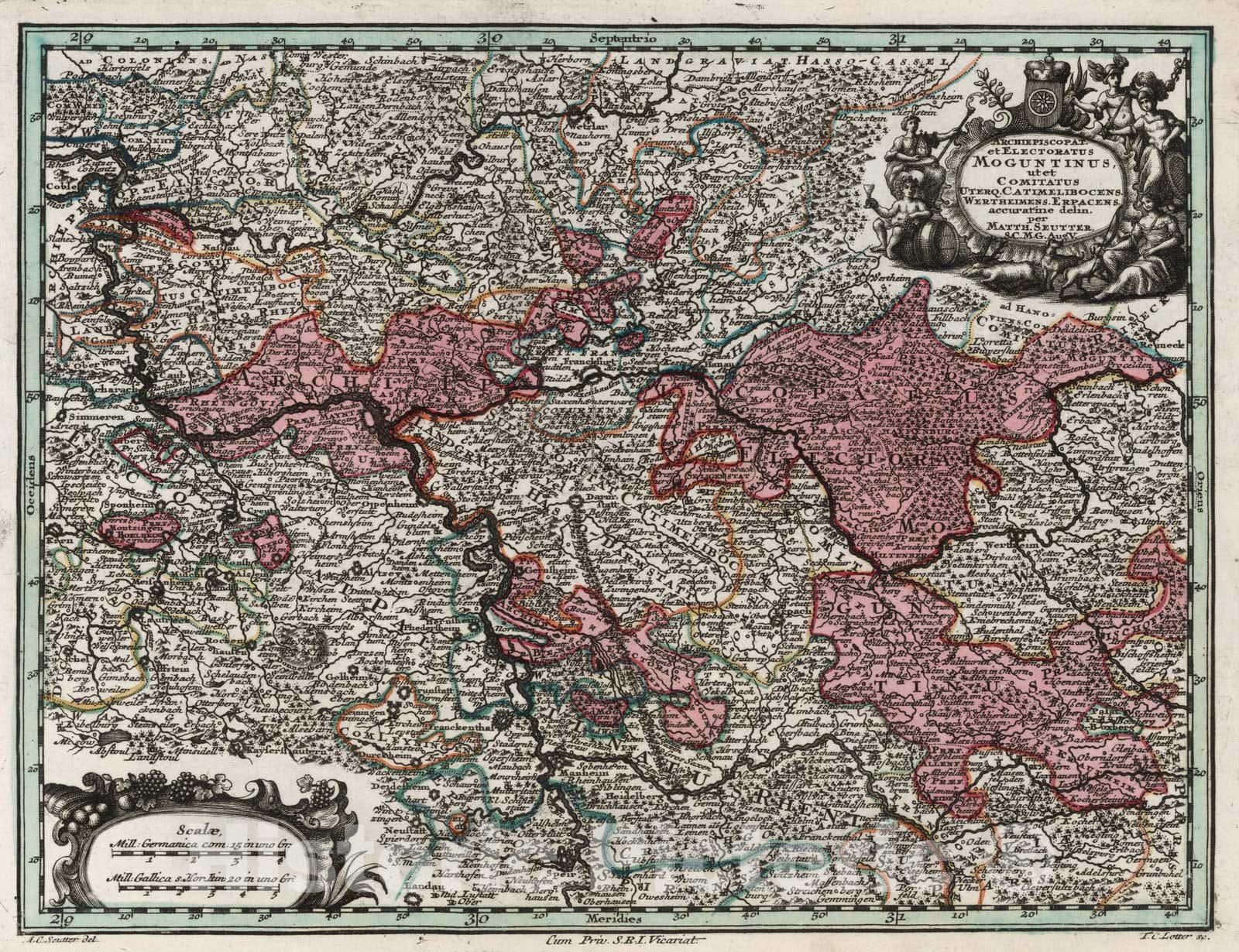 Archiepiscopat. et Electoratus Moguntinus, ut et Comitatus Uterq. Catimelibocens. Wertheimens. Erpacens. accurat.me delin. per Matth. Seutter, S.C.M.G. Aug. V. ; A.C. Seutter del.Tob. Con. Lotter, sc. (to accompany) Atlas minor praecipua orbis terrarum imperia. | Atlas minor praecipua orbis terrarum imperia, Regna et Provincias, Germaniae Potissimum, tabellis 50 exacte declineatis sistens usui militiae ducum ac peregrinantium maxime accomodatus opera Matthaei Seutteri, Sac. Caes. Maj. Geogr. Aug. Vind. Jacob Christoph Weyerman ... Cum Privileg: S.R.I. Vicariat. in part: Rheni, Franc: et Suev Juris. Martin Gottfried Crophius Sculps. | Atlas minor: Special World empires, kingdoms and provinces, Germany, etc., with 59 copper plate outline and full color maps. World map bound upside down. Date of publication from: Tooley, R.V. Dict. of mapmakers. Drawn by Jacob Christoph Weyerman, engraved by Albrecht Seutter, Andrea Silbereisen, Tobias Lotter, Matthaeus Lainpacher and Martin Gottfried Crophius. Numbered manuscript index at the front written in French. Tucked into the atlas is a folded circular celestial map of the southern hemisphere. Includes a map of Genoa not listed in the index. Each map shows one or more cartouches with figures, animals etc. Bound in Bound in marble papered, half leather covers with no title on cover.