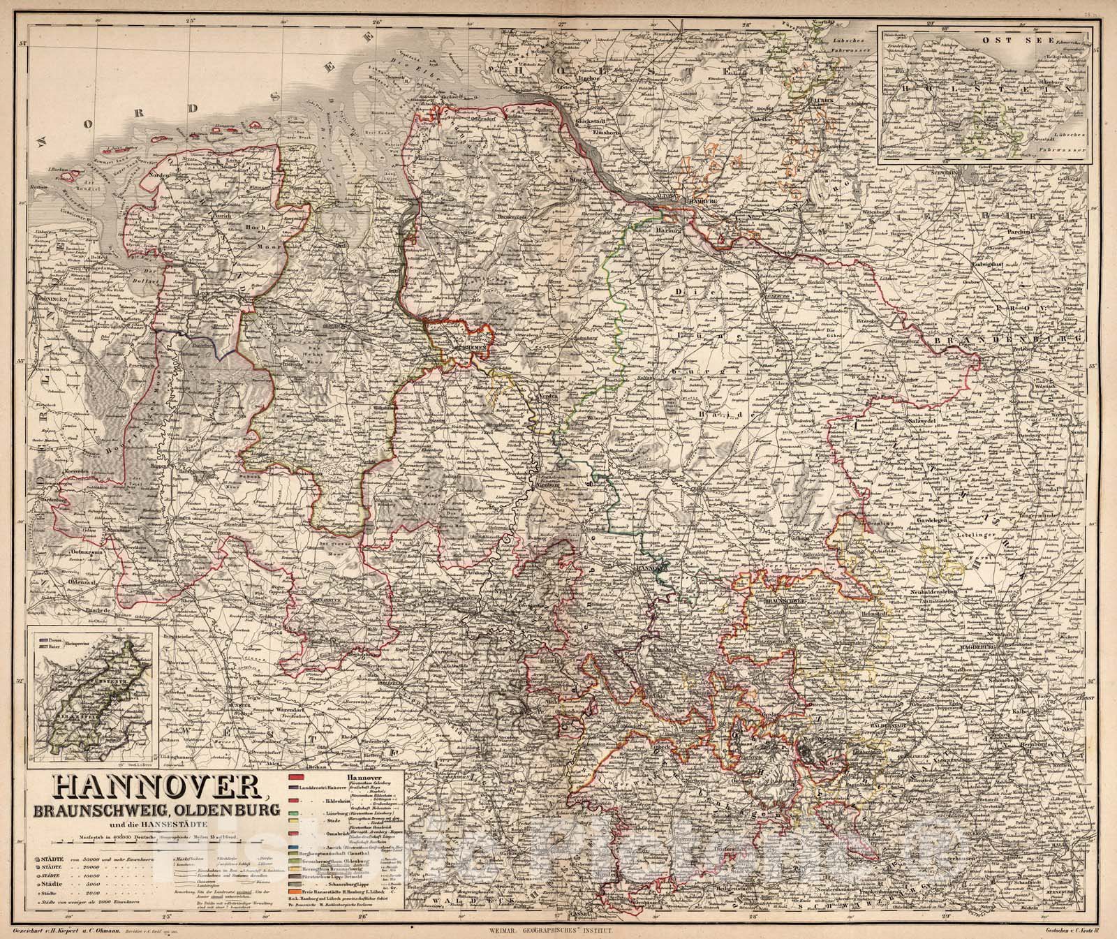 Hannover, Braunschweig, Oldenburg und die Hansestadte. Gezeichnet v. H. Kiepert u. C. Ohmann. Revidirt 1866, 1967. Gestochen v. C. Kratz III. Weimar: Geographisches Institut. (with 2 insets). (to accompany) Hand - Atlas Der Erde Und Des Himmels. | Hand - Atlas Der Erde Und Des Himmels. In siebzig Blattern. Zweiundvierzigste Auflage. Bearbeitet Von Dr. H. Kiepert, C. Graf, A. Graf Und Dr. C. Bruhns. Weimar, Geographisches Institut. | This 42nd edition is the first one in Which the brothers Carl and Adolf Graef are mentioned as the authors. Maps by H. Kiepert, Graf & Bruhns. Listed in Phillips under Kiepert. Many of the maps are now lithographed, although some are engraved, outline color, 70 � 57 or smaller. Covers are half leather black marbled paper covered boards. The atlas was published in installments, maps are dated from 1856 to 1867. The first map sheets Appeared in 1856. Copies from the years 1857-1860 were supplemented with maps from the 41st edition. The first 2 maps are world maps: the hemispheres and a world map in Mercator's projection. Followed by 3 thematic maps: two physical ones and a sheet of mountain profiles. Next are 2 maps of Europe, 23 maps of Austria and Germany, France printed in 4 sheets, and 19 maps of the other European countries, 5 maps of Asia, 4 of Africa, another 7 of the Americas and 2 of Australia/Oceania. The last 3 maps depict the northern and southern skies and the solar system, thereby justifying the title 'Hand-Atlas der Erde und des Himmels. No year is Mentioned on the title page. The publication year given (1867) is the year of the most recent maps of the atlas. The 42 edition was completed in 1861. In almost all of the years 1862-1869 revised printings of the 42nd edition were published, for example in which the Italian unification has been incorporated. In later printings - after the Austro-Prussian War in 1866 - the maps of Central Europe have a different order, where Germany precedes Austria.